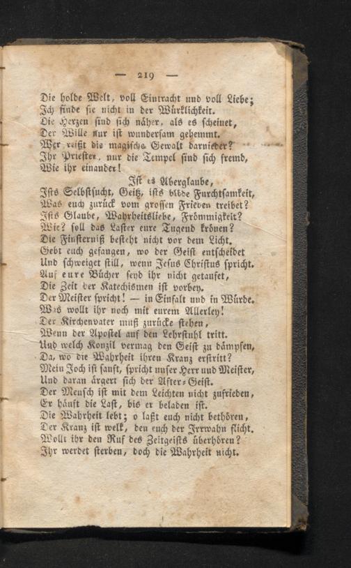Ifts Selbstsucht, Geiß, ists blide Furchtsamkeit, Was euch zurück vom grossen Frieden treibet? Ffits Glaube, Wahrheitsliebe, Frömmigkeit? Wie? soll das Lafter eure Tugend krönen? Die Finsterniß besteht nicht vor dem Licht. Gebt euch gefangen, wo der Geist entscheidet Und schweiget still, wenn Jesus Christus spricht. Auf eure Bücher send ihr nicht getaufet, Die Zeit der Katechismen ist vorbey.