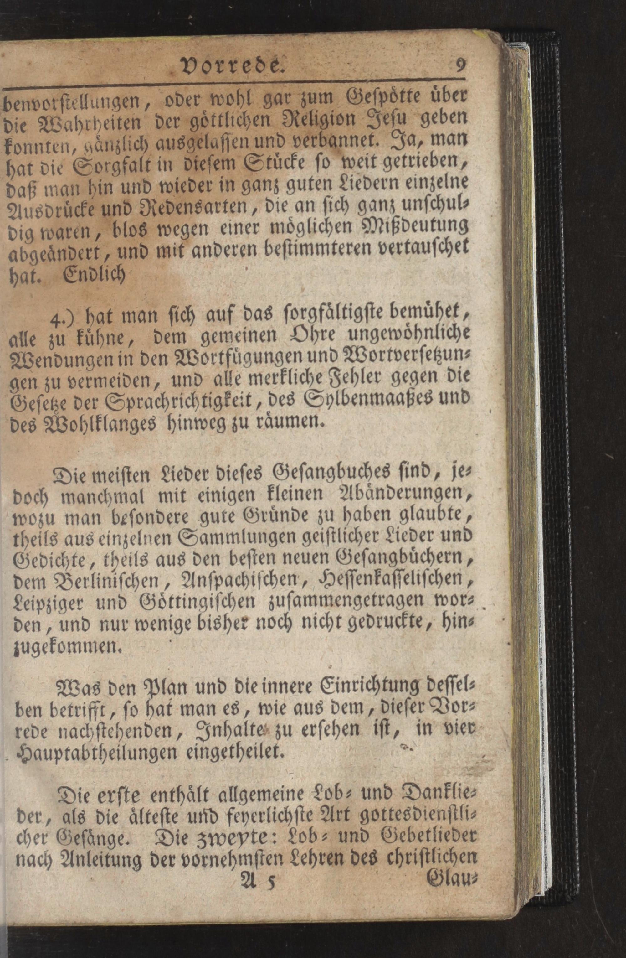Die meisten Lieder dieses Gesangbuches sind, jes doch manchmal mit einigen kleinen Abänderungen, wozu man besondere gute Gründe zu haben glaubte, theils aus einzelnen Sammlungen geistlicher Lieder und Gedichte, theils aus den besten neuen Gesangbüchern, dem Berlinischen, Anspachischen, Hessenkaffelischen, Leipziger und Göttingischen zusammengetragen wors den, und nur wenige bisher noch nicht gedruckte, hins zugekommen.