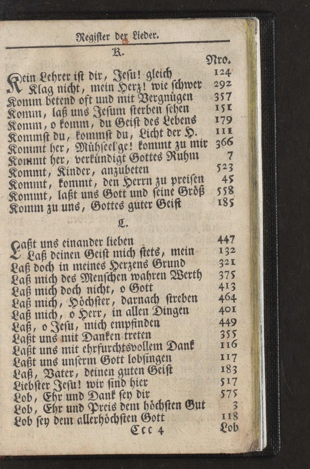 Dein Lehrer ist dir, Jesu! gleich Klag nicht, mein Herz! wie schwer Komm betend oft und mit Vergnügen Komm, laß uns Jesum sterben sehen Komm, o komm, du Geist des Lebens Kommst du, kommst du, Licht der H. Kommt her, Mühseel'ge! kommt zu mir Kommt her, verkündigt Gottes Ruhm Kommt, Kinder, anzubeten