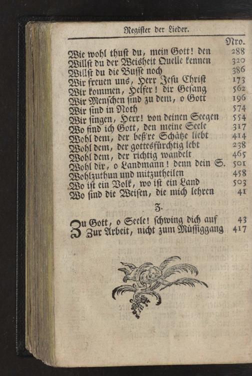 Wir singen, Herr! von deinen Seegen Wo find ich Gott, den meine Seele Wohl dem, der beß're Schätze liebt Wohl dem, der gottesfürchtig lebt Wohl dem, der richtig wandelt Wohl dir, o Landmann! denn dein S. jor Wohlzuthun und mitzutheilen Wo ist ein Volk, wo ist ein Land Wo sind die Weisen, die mich lehren