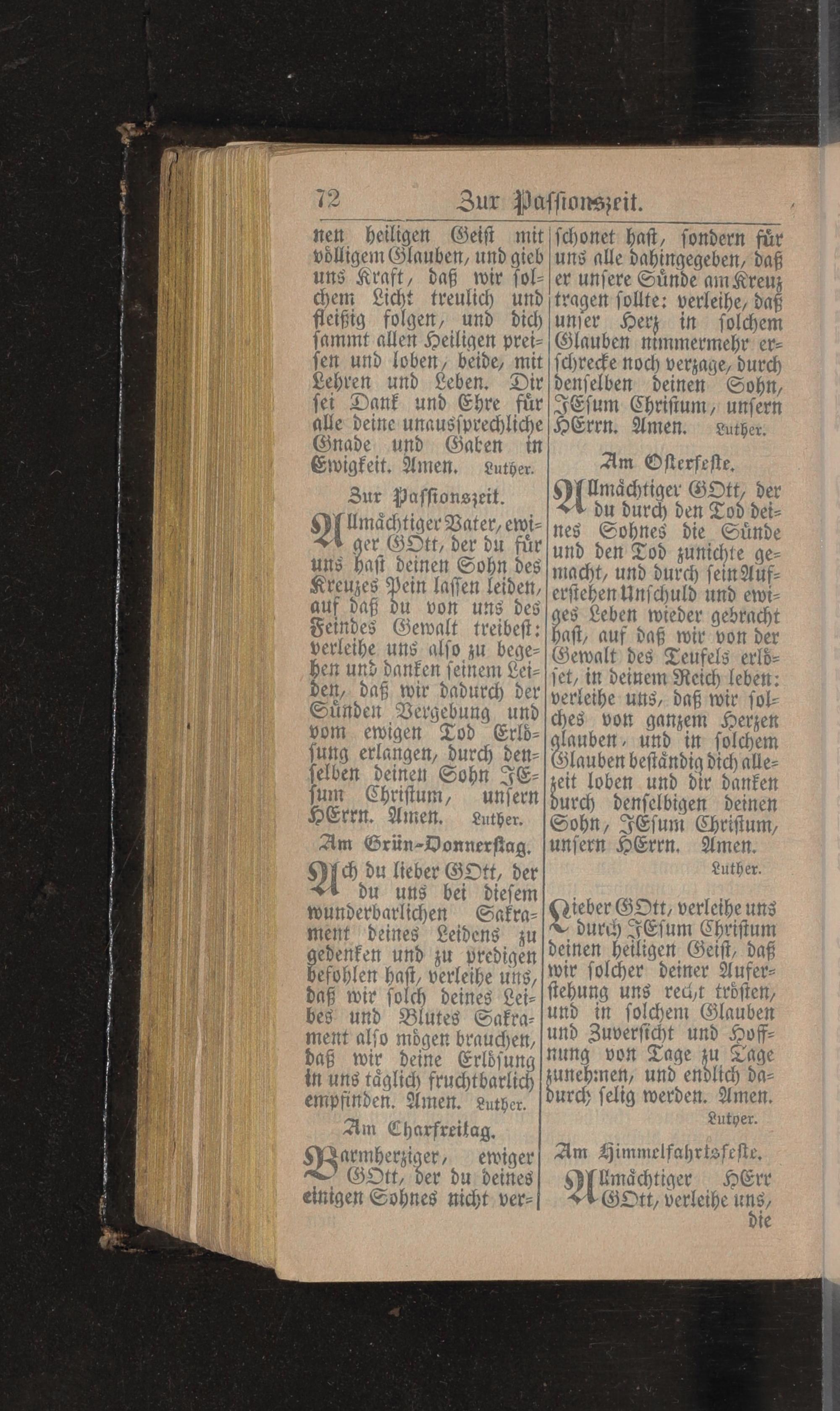 ger GOtt, der du für und den Tod zunichte geuns haft deinen Sohn des macht, und durch sein AufKreuzes Pein lassen leiden, erstehen Unschuld und ewiauf daß du von uns des ges Leben wieder gebracht Feindes Gewalt treibest: haft, auf daß wir von der verleihe uns also zu bege- Gewalt des Teufels erldben und danken seinem Lei- jet, in deinem Reich lebent: den, daß wir dadurch der verleihe uns, daß wir solSünden Vergebung und ches von ganzem Herzen vom ewigen Tod Erld- glauben, und in solchem sung erlangen, durch den Glauben beständig dich alleselben deinen Sohn JE- zeit loben und dir danken sum Christum, unsern durch denselbigen deinen HErrn. Amen. Luther. Sohn, Jesum Christum, Am Grün- Donnerstag. unsern HErrn. Amen.