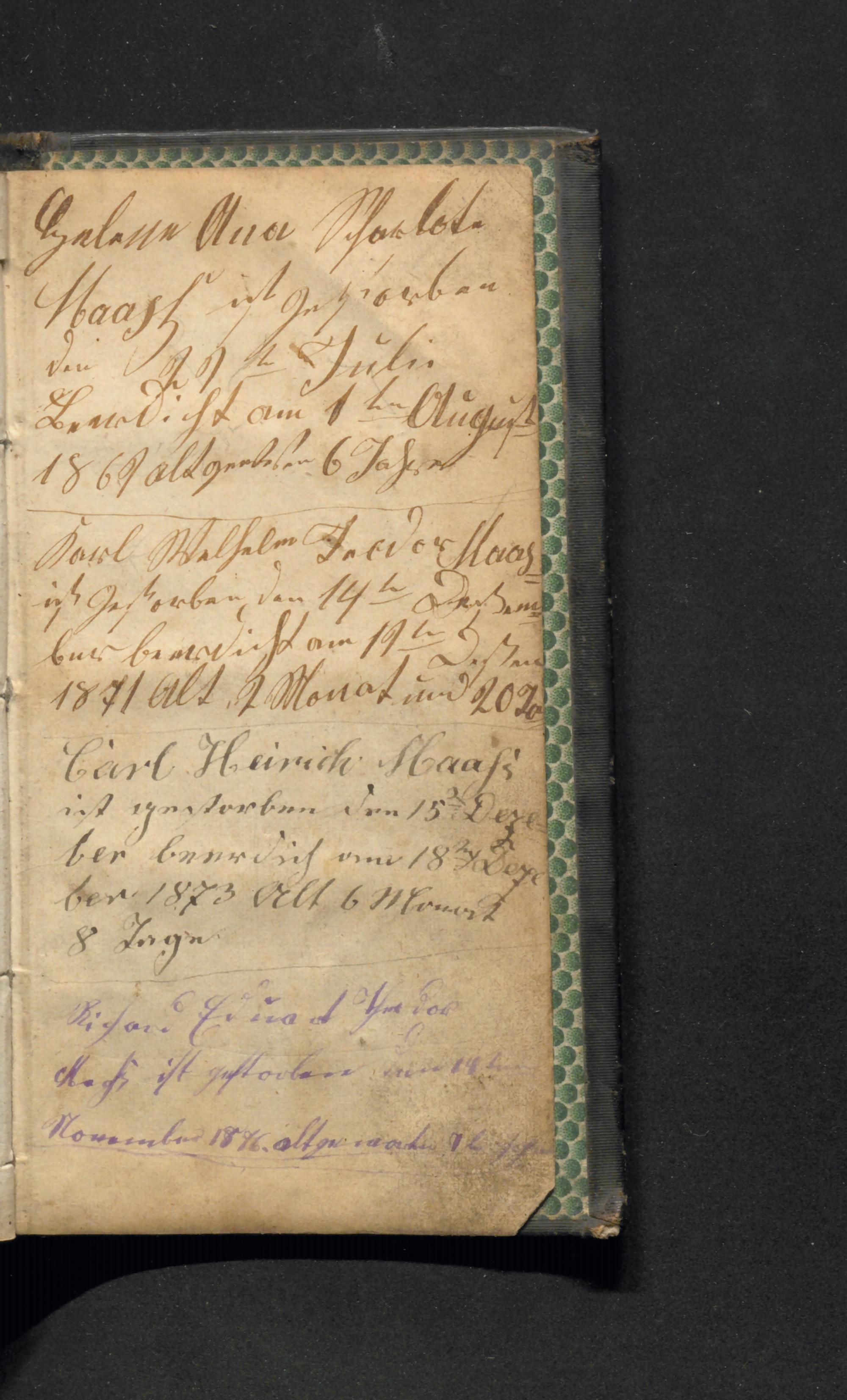 Carl Heiniche Mausi ist gestorben den 15. Deze ber beurdich am 18. ber 1873 Alt 6 Monat 8