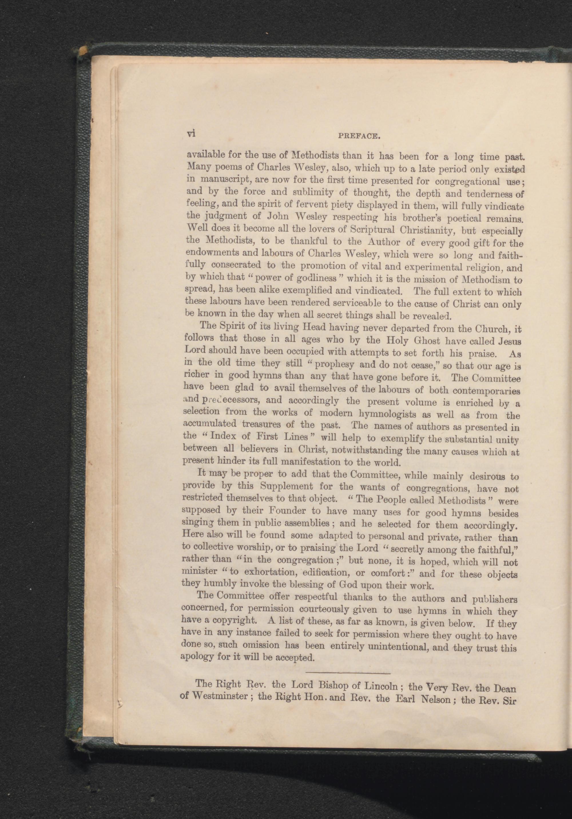 The Committee offer respectful thanks to the authors and publishers concerned, for permission courteously given to use hymns in which they have a copyright. A list of these, as far as known, is given below. If they have in any instance failed to seek for permission where they ought to have done so, such omission has been entirely unintentional, and they trust this apology for it will be accepted.