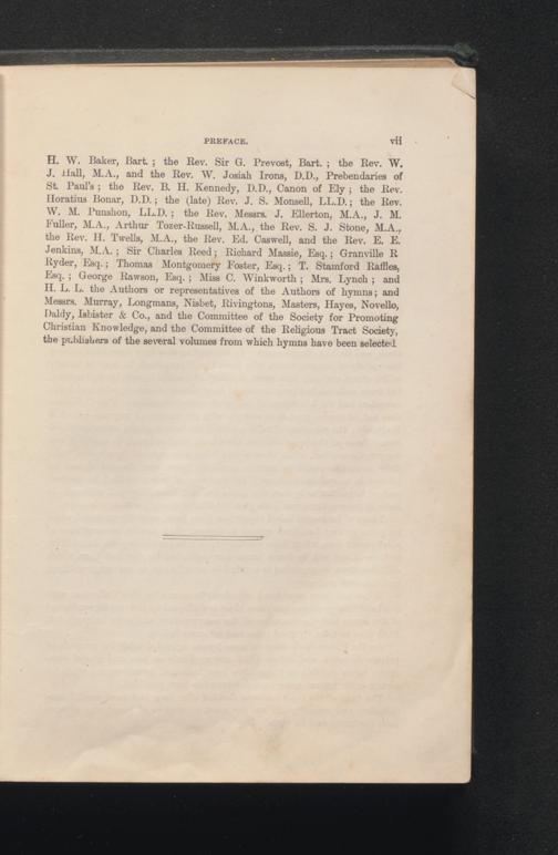 H. W. Baker, Bart.; the Rev. Sir G. Prevost, Bart.; the Rev. W. J. Hall, M.A., and the Rev. W. Josiah Irons, D.D., Prebendaries of St. Paul's; the Rev. B. H. Kennedy, D.D., Canon of Ely; the Rev. Horatius Bonar, D.D.; the( late) Rev. J. S. Monsell, LL.D.; the Rev. W. M. Punshon, LL.D.; the Rev. Messrs. J. Ellerton, M.A., J. M. Fuller, M.A., Arthur Tozer- Russell, M.A., the Rev. S. J. Stone, M.A., the Rev. H. Twells, M.A., the Rev. Ed. Caswell, and the Rev. E. E. Jenkins, M.A.; Sir Charles Reed; Richard Massie, Esq.; Granville R Ryder, Esq.; Thomas Montgomery Foster, Esq.; T. Stamford Raffles, Esq.; George Rawson, Esq.; Miss C. Winkworth; Mrs. Lynch; and H. L. L. the Authors or representatives of the Authors of hymns; and Messrs. Murray, Longmans, Nisbet, Rivingtons, Masters, Hayes, Novello, Daldy, Isbister& Co., and the Committee of the Society for Promoting Christian Knowledge, and the Committee of the Religious Tract Society, the publishers of the several volumes from which hymns have been selected.