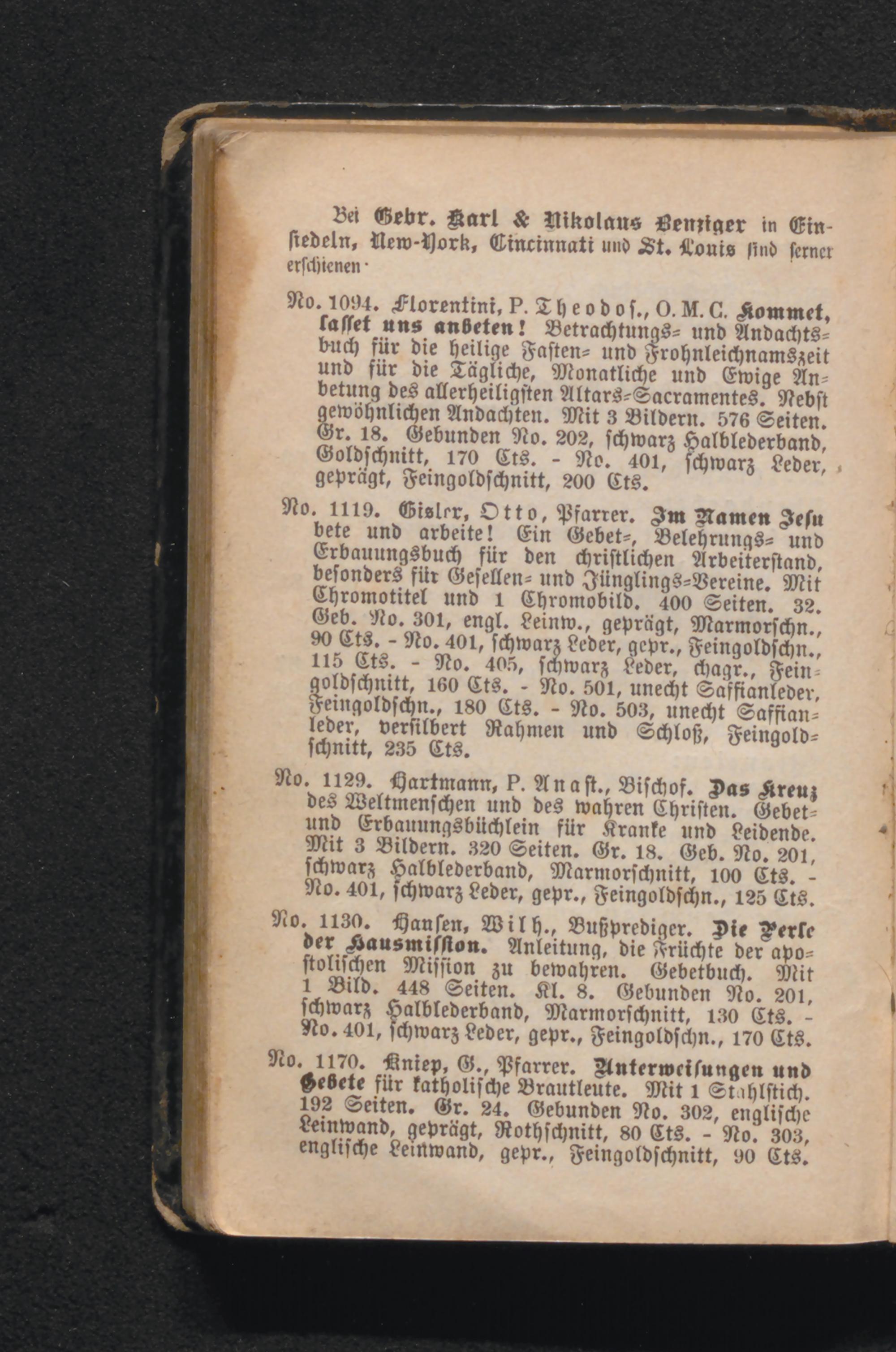 No. 1119. Gisler, Otto, Pfarrer. Im Namen Jesu bete und arbeite! Ein Gebet-, Belehrungs- und Erbauungsbuch für den christlichen Arbeiterstand, besonders für Gesellen- und Jünglings- Vereine. Mit Chromotitel und 1 Chromobild. 400 Seiten. 32. Geb. No. 301, engl. Peinw., geprägt, Marmorschn., 90 Cts.- No. 401, schwarz Leder, gepr., Feingoldschn., 115 Cts. No. 405, schwarz Leder, chagr., Feingoldschnitt, 160 Cts.- No. 501, unecht Saffianleder, Feingoldschn., 180 Cts.- No. 503, unecht Saffianleder, verfilbert Rahmen und Schloß, Feingoldschnitt, 235 Cts.