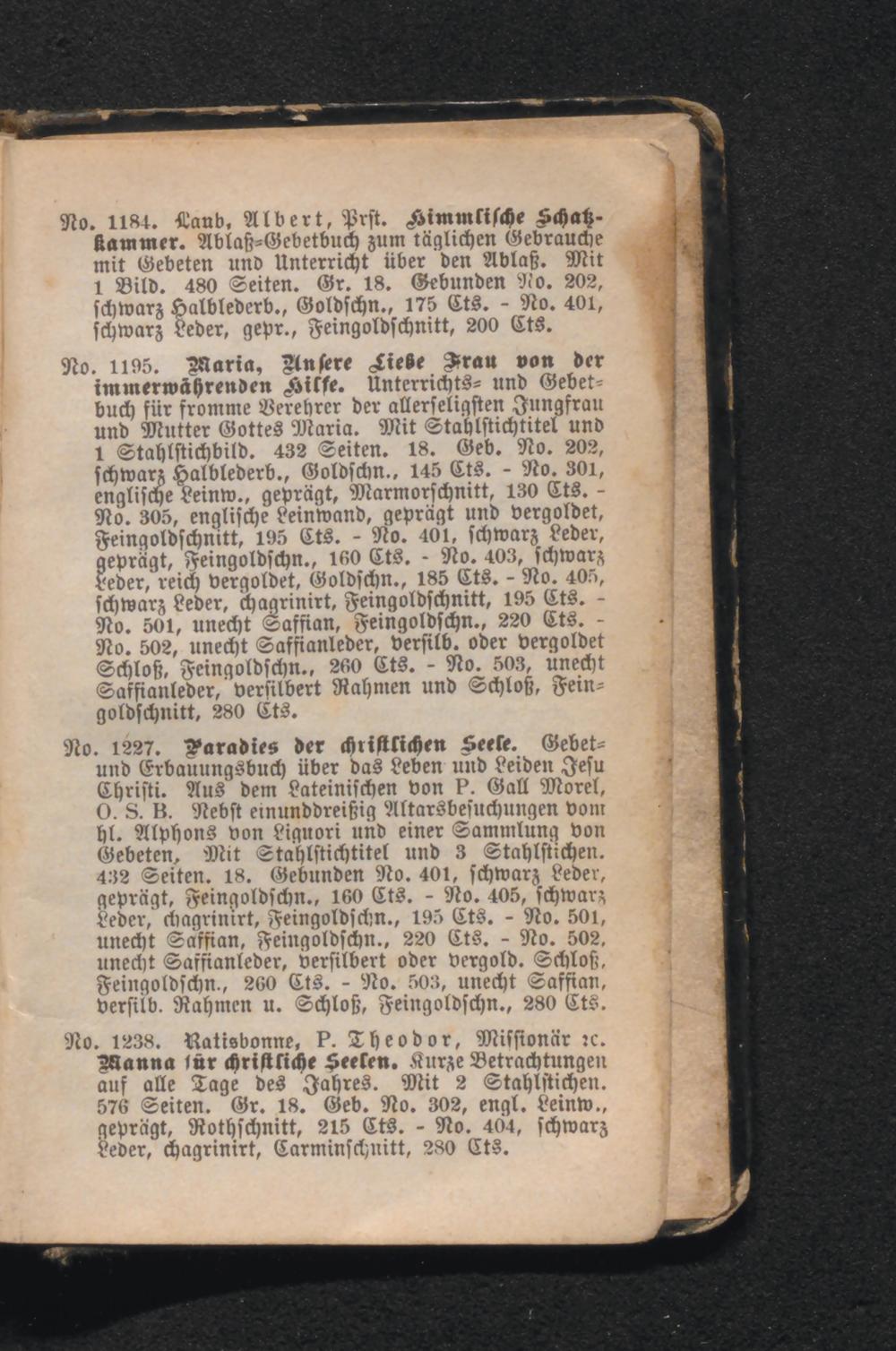 No. 1184. Laub, Albert, Prst. Himmlische Schatzkammer. Ablaß- Gebetbuch zum täglichen Gebrauche mit Gebeten und Unterricht über den Ablaß. Mit 1 Bild. 480 Seiten. Gr. 18. Gebunden No. 202, No. 401, schwarz Halblederb., Goldschn., 175 Cts. schwarz Leder, gepr., Feingoldschnitt, 200 Cts.