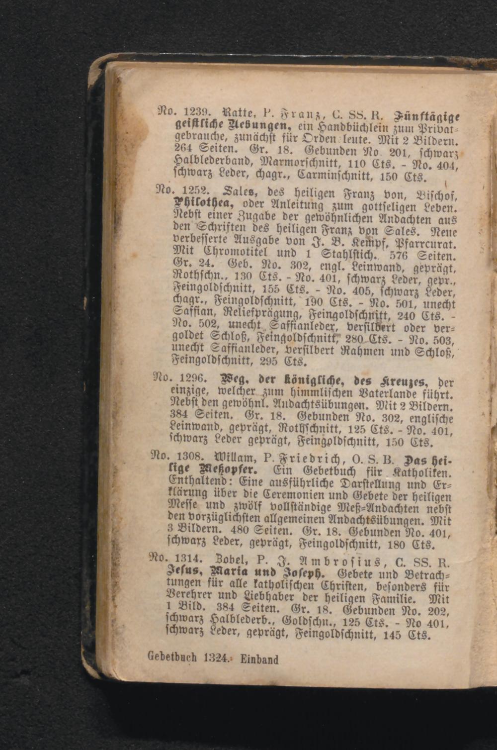 No. 1252. Sales, des heiligen Franz von, Bischof, Philothea, oder Anleitung zum gottseligen Leben. Nebst einer Zugabe der gewöhnlichen Andachten aus den Schriften des heiligen Franz von Sales. Nene verbesserte Ausgabe von J. B. Kempf, Pfarrcurat. Mit Chromotitel und 1 Stahlstich. 576 Seiten. Gr. 24. Geb. No. 302, engl. Leinwand, geprägt, Rothschn., 130 Cts.- No. 401, schwarz Leder, gepr., Feingoldschnitt, 155 Cts. No. 405, schwarz Leder, chagr., Feingoldschnitt, 190 Cts.- No. 501, unecht Saffian, Reliefprägung, Feingoldschnitt, 240 Cts. No. 502, unecht Saffianleder, versilbert oder vergoldet Schloß, Feingoldschnitt, 280 Cts.- No. 503, unecht Saffianleder, versilbert Rahmen und Schloß, Feingoldschnitt, 295 Cts.