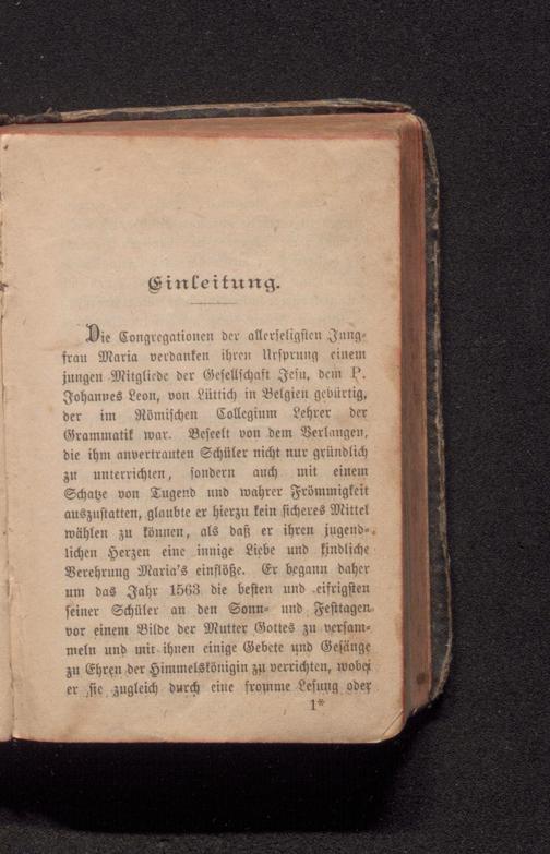 frau Maria verdanken ihren Ursprung einem jungen Mitgliede der Gesellschaft Jesu, dem P. Johannes Leon, von Lüttich in Belgien gebürtig, der. im Römischen Collegium Lehrer der Grammatik war. Beseelt von dem Verlangen, die ihm anvertrauten Schüler nicht nur gründlich zu unterrichten, sondern auch mit einem Schatze von Tugend und wahrer Frömmigkeit auszustatten, glaubte er hierzu kein sicheres Mittel wählen zu können, als daß er ihren jugend-. lichen Herzen eine innige Liebe und findliche Verehrung Maria's einflöße. Er begann daher um das Jahr 1563 die besten und eifrigsten seiner Schüler an den Sonn- und Festtagen vor einem Bilde der Mutter Gottes zu versammeln und mit ihnen einige Gebete und Gesänge zu Ehren der Himmelskönigin zu verrichten, wobei er sie zugleich durch eine fromme Lesung oder 1*