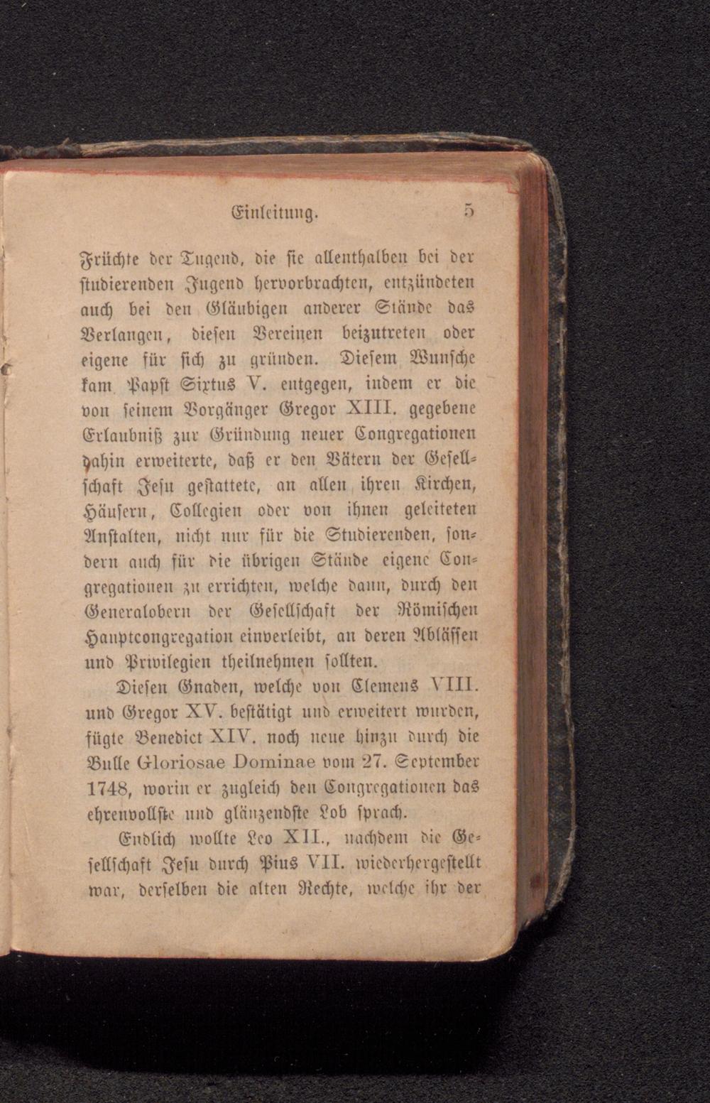 Früchte der Tugend, die sie allenthalben bei der studierenden Jugend hervorbrachten, entzündeten auch bei den Gläubigen anderer Stände das Verlangen, diesen Vereinen beizutreten oder eigene für sich zu gründen. Diesem Wunsche kam Papst Sixtus V. entgegen, indem er die von seinem Vorgänger Gregor XIII. gegebene Erlaubniß zur Gründung neuer Congregationen dahin erweiterte, daß er den Vätern der Gesellschaft Jesu gestattete, an allen ihren Kirchen, Häusern, Collegien oder von ihnen geleiteten Anstalten, nicht nur für die Studierenden, sondern auch für die übrigen Stände eigene Congregationen zu errichten, welche dann, durch den Generalobern der Gesellschaft der Römischen Hauptcongregation einverleibt, an deren Abläffen und Privilegien theilnehmen sollten.