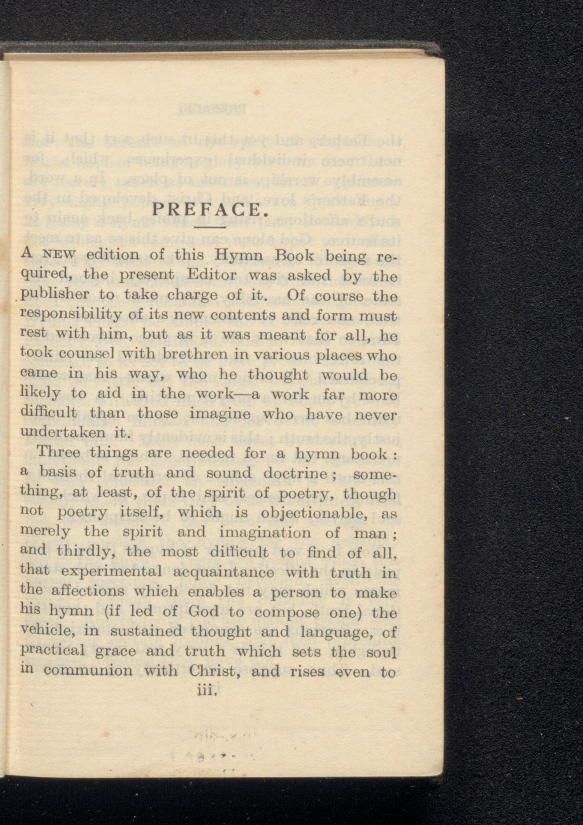 A NEW edition of this Hymn Book being required, the present Editor was asked by the publisher to take charge of it. Of course the responsibility of its new contents and form must rest with him, but as it was meant for all, he took counsel with brethren in various places who came in his way, who he thought would be likely to aid in the work- a work far more difficult than those imagine who have never undertaken it.