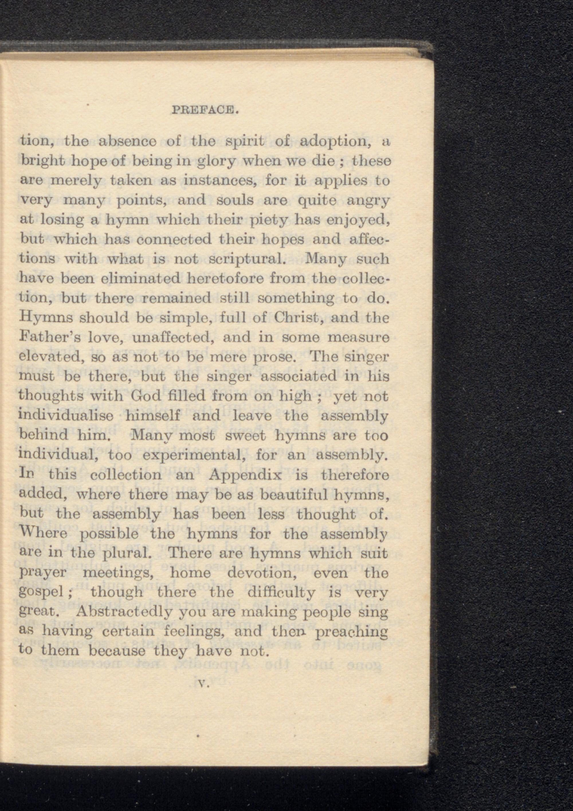 tion, the absence of the spirit of adoption, a bright hope of being in glory when we die; these are merely taken as instances, for it applies to very many points, and souls are quite angry at losing a hymn which their piety has enjoyed, but which has connected their hopes and affections with what is not scriptural. Many such have been eliminated heretofore from the collection, but there remained still something to do. Hymns should be simple, full of Christ, and the Father's love, unaffected, and in some measure elevated, so as not to be mere prose. The singer must be there, but the singer associated in his thoughts with God filled from on high; yet not individualise himself and leave the assembly behind him. Many most sweet hymns are too individual, too experimental, for an assembly. In this collection an Appendix is therefore added, where there may be as beautiful hymns, but the assembly has been less thought of. Where possible the hymns for the assembly are in the plural. There are hymns which suit prayer meetings, home devotion, even even the gospel; though there the difficulty is very great. Abstractedly you are making people sing as having certain feelings, and then preaching to them because they have not.