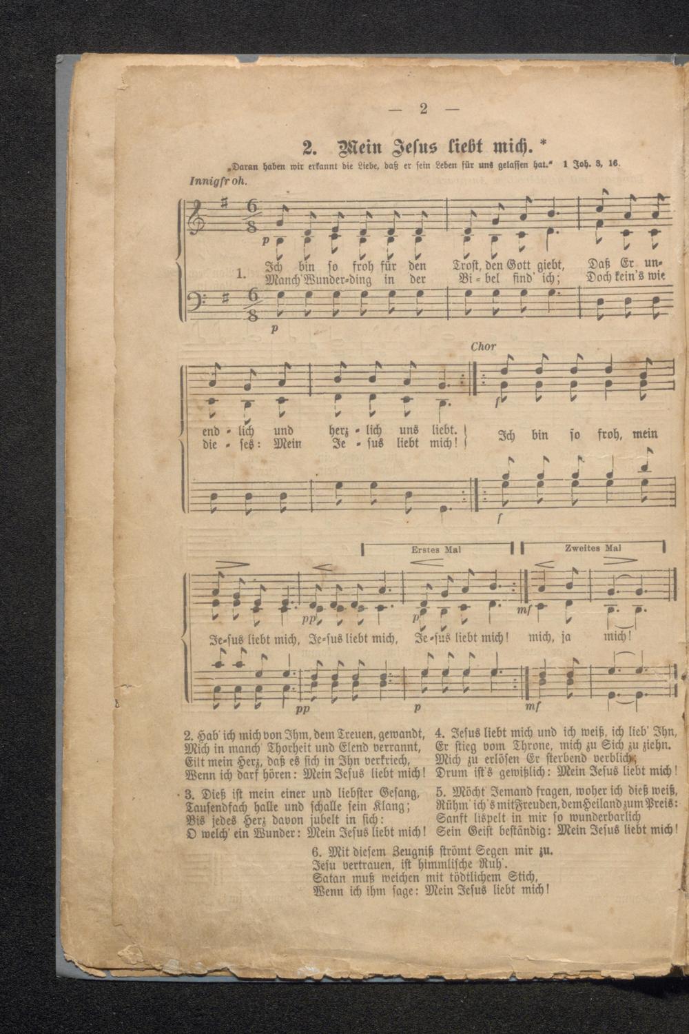 2. Hab' ich mich von Ihm, dem Treuen, gewandt, Mich in manch' Thorheit und Elend verrannt, Eilt mein Herz, daß es sich in Ihn verkriech, Wenn ich darf hören: Mein Jefus liebt mich! 3. Dieß ist mein einer und liebster Gesang, Tausendfach halle und schalle sein Klang; Bis jedes Herz davon jubelt in sich: O welch' ein Wunder: Mein Jesus liebt mich!