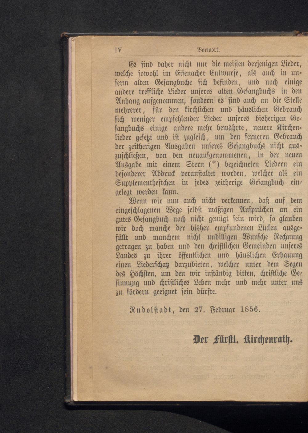 Es sind daher nicht nur die meisten derjenigen Lieder, welche sowohl im Eisenacher Entwurfe, als auch in unferm alten Gesangbuche sich befinden, und noch einige andere treffliche Lieder unseres alten Gesangbuchs in den Anhang aufgenommen, sondern es sind auch an die Stelle mehrerer, für den kirchlichen und häuslichen Gebrauch sich weniger empfehlender Lieder unseres bisherigen Gesangbuchs einige andere mehr bewährte, neuere Kirchenlieder gesetzt und ist zugleich, um den ferneren Gebrauch der zeitherigen Ausgaben unseres Gesangbuchs nicht auszuschließen, von den neuaufgenommenen, in der neuen Ausgabe mit einem Stern(*) bezeichneten Liedern ein besonderer Abdruck veranstaltet worden, welcher als ein Supplementheftchen in jedes zeitherige Gesangbuch eingelegt werden kann.