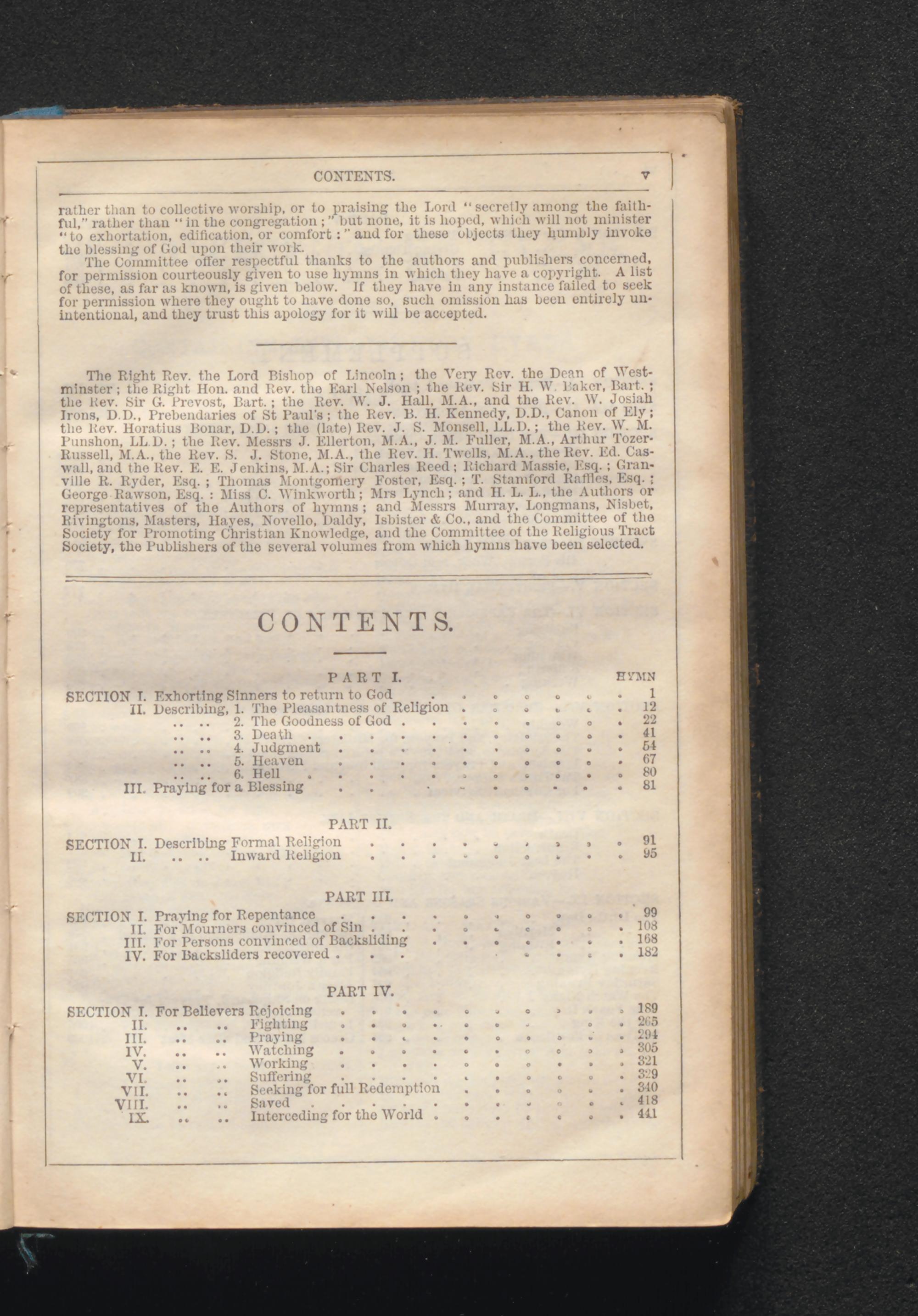 The Right Rev. the Lord Bishop of Lincoln; the Very Rev. the Dean of Westminster; the Right Hon. and Rev. the Earl Nelson; the Rev. Sir H. W. Baker, Bart.; the Rev. Sir G. Prevost, Bart.; the Rev. W. J. Hall, M.A., and the Rev. W. Josiah Irons, D.D., Prebendaries of St Paul's; the Rev. B. H. Kennedy, D.D., Canon of Ely; the Rev. Horatius Bonar, D.D.; the( late) Rev. J. S. Monsell, LL.D.; the Rev. W. M. Punshon, LL.D.; the Rev. Messrs J. Ellerton, M.A., J. M. Fuller, M.A., Arthur TozerRussell, M. A., the Rev. S. J. Stone, M.A., the Rev. H. Twells, M. A., the Rev. Ed. Caswall, and the Rev. E. E. Jenkins, M.A.; Sir Charles Reed; Richard Massie, Esq.; Granville R. Ryder, Esq.; Thomas Montgomery Foster, Esq.; T. Stamford Raffles, Esq.; George Rawson, Esq.: Miss C. Winkworth; Mrs Lynch; and H. L. L., the Authors or representatives of the Authors of hymns; and Messrs Murray, Longmans, Nisbet, Rivingtons, Masters, Hayes, Novello, Daldy, Isbister& Co., and the Committee of the Society for Promoting Christian Knowledge, and the Committee of the Religious Tract Society, the Publishers of the several volumes from which hymns have been selected.