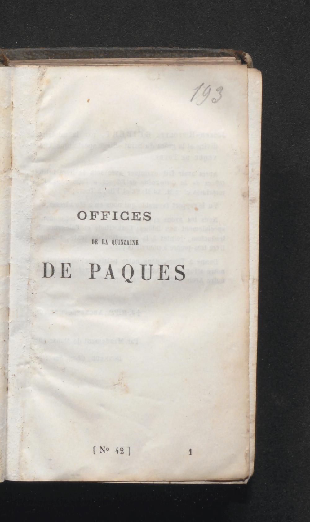 Offices de la quinzaine de Paques a l'usage de Rome entièrement refondus : d'après les éditions les plus récentes du Bréviaire et du Missel romains ; augmentés de l'exercice du chemin de la croix ; traduction nouvelle ; approuvé par Mons. L'Archevêque de Tours