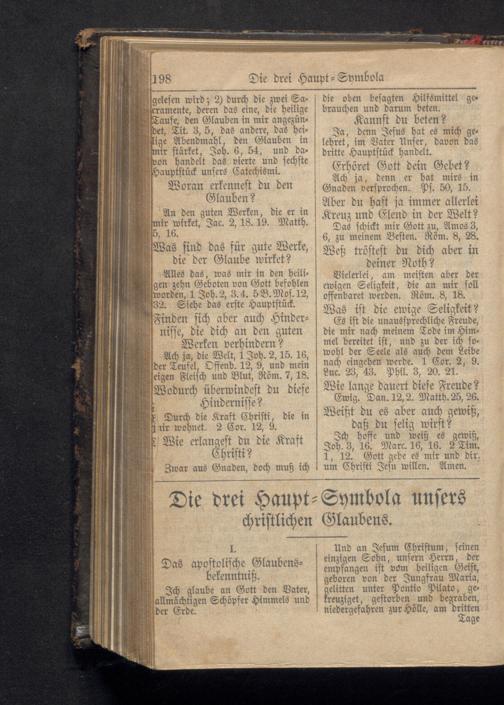 gelesen wird; 2) durch die zwei Sacramente, deren das eine, die heilige Taufe, den Glauben in mir angezündet, Tit. 3, 5, das andere, das heilige Abendmahl, den Glauben mir stärket, Joh. 6, 54, und davon handelt das vierte und sechste Hauptstück unsers Catechismi.