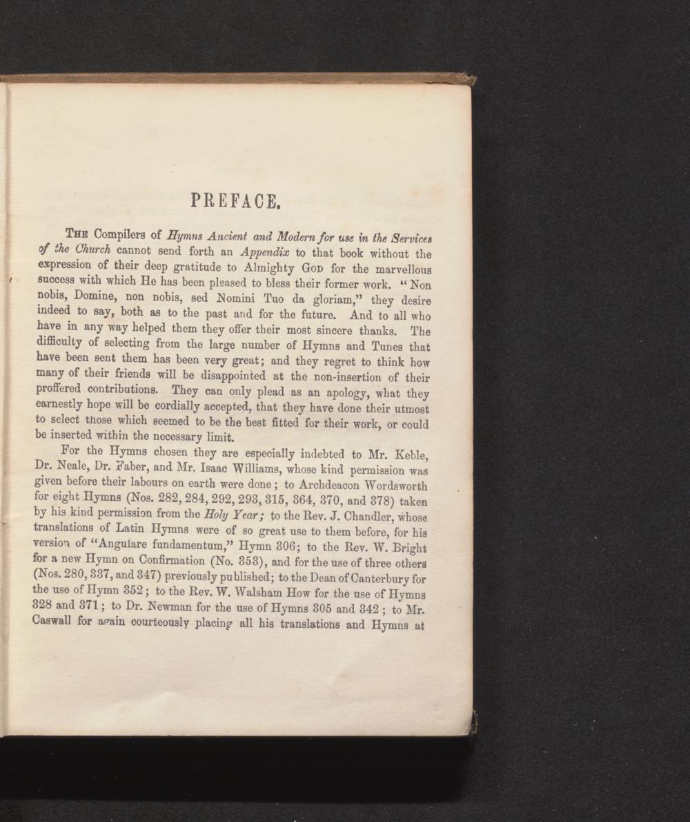 For the Hymns chosen they are especially indebted to Mr. Keble, Dr. Neale, Dr. Faber, and Mr. Isaac Williams, whose kind permission was given before their labours on earth were done; to Archdeacon Wordsworth for eight Hymns( Nos. 282, 284, 292, 293, 315, 364, 370, and 378) taken by his kind permission from the Holy Year; to the Rev. J. Chandler, whose translations of Latin Hymns were of so great use to them before, for his version of" Angulare fundamentum," Hymn 306; to the Rev. W. Bright for a new Hymn on Confirmation( No. 353), and for the use of three others ( Nos. 280, 337, and 347) previously published; to the Dean of Canterbury for the use of Hymn 352; to the Rev. W. Walsham How for the use of Hymns 328 and 371; to Dr. Newman for the use of Hymns 305 and 342; to Mr. Caswall for again courteously placing all his translations and Hymns at