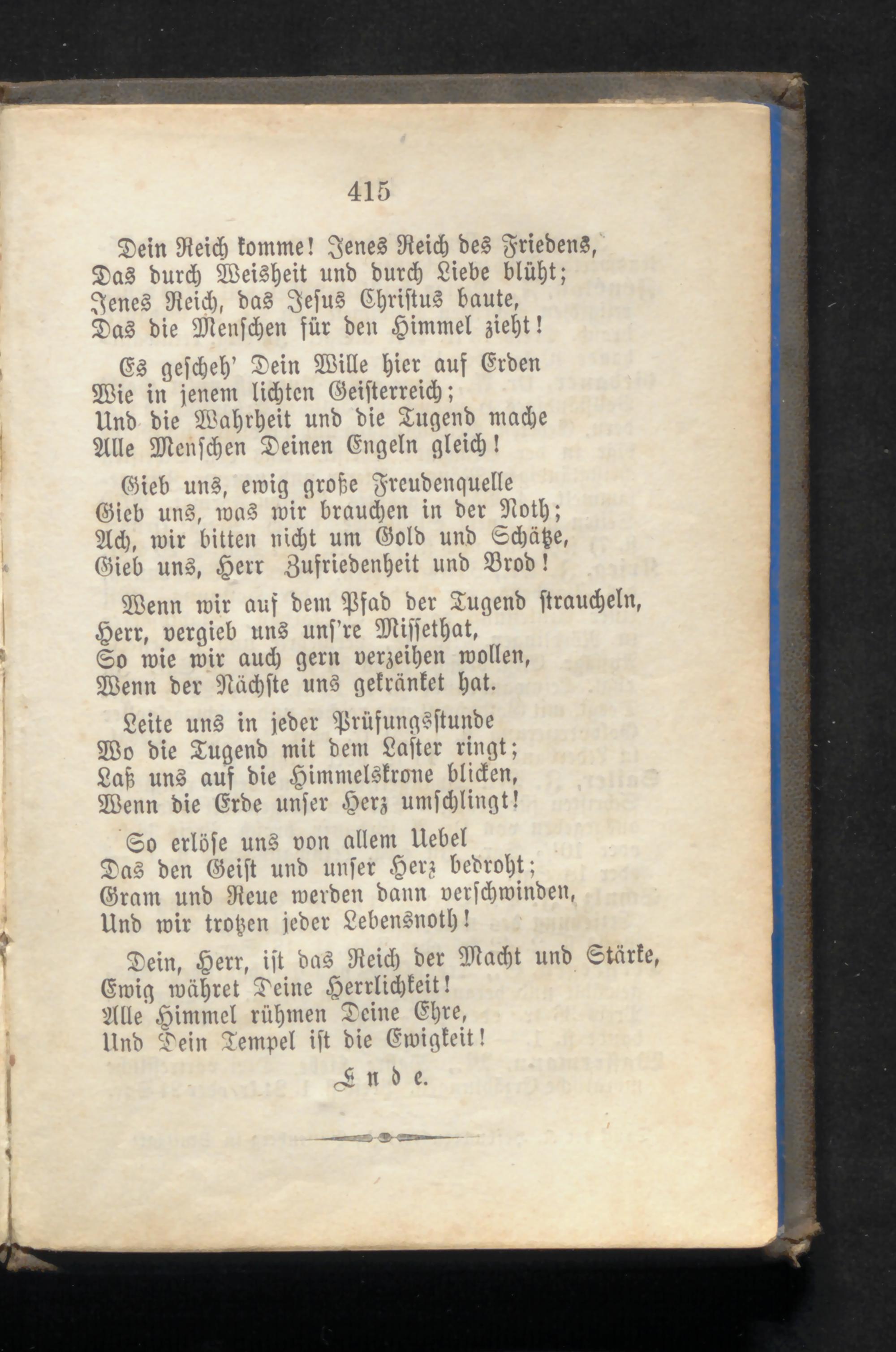 Dein, Herr, ist das Reich der Macht und Stärke, Ewig währet Teine Herrlichkeit! Alle Himmel rühmen Deine Ehre, Und Dein Tempel ist die Ewigkeit! Ende.