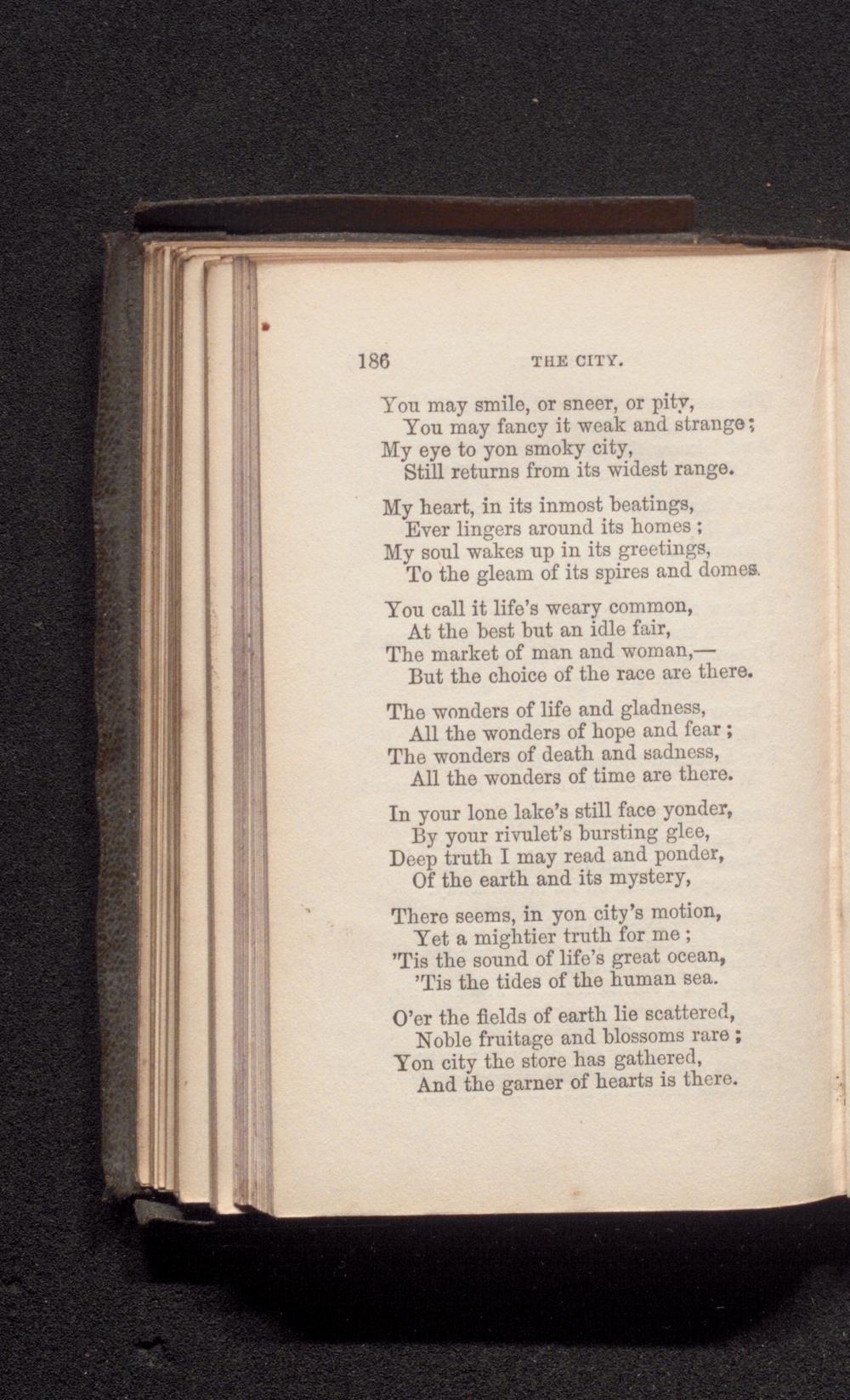There seems, in yon city's motion, Yet a mightier truth for me; " Tis the sound of life's great ocean, " Tis the tides of the human sea.