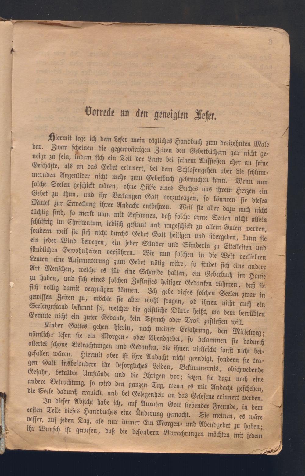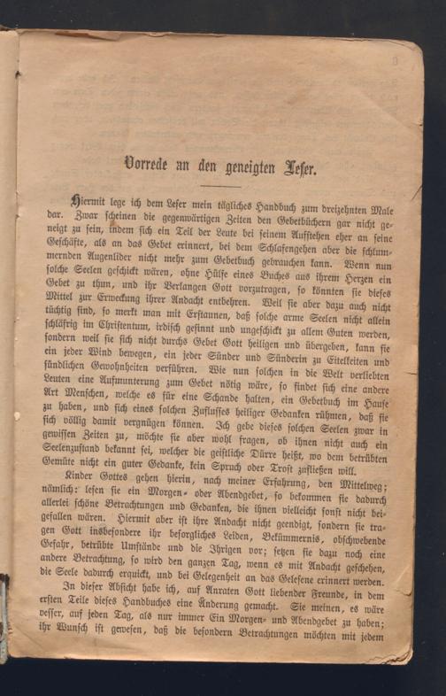 In dieser Absicht habe ich, auf Anraten Gott liebender Freunde, in dem ersten Teile dieses Handbuches eine Änderung gemacht. Sie meinen, es wäre veffer, auf jeden Tag, als nur immer Ein Morgen- und Abendgebet zu haben; ihr Wunsch ist gewesen, daß die besondern Betrachtungen möchten mit jedem