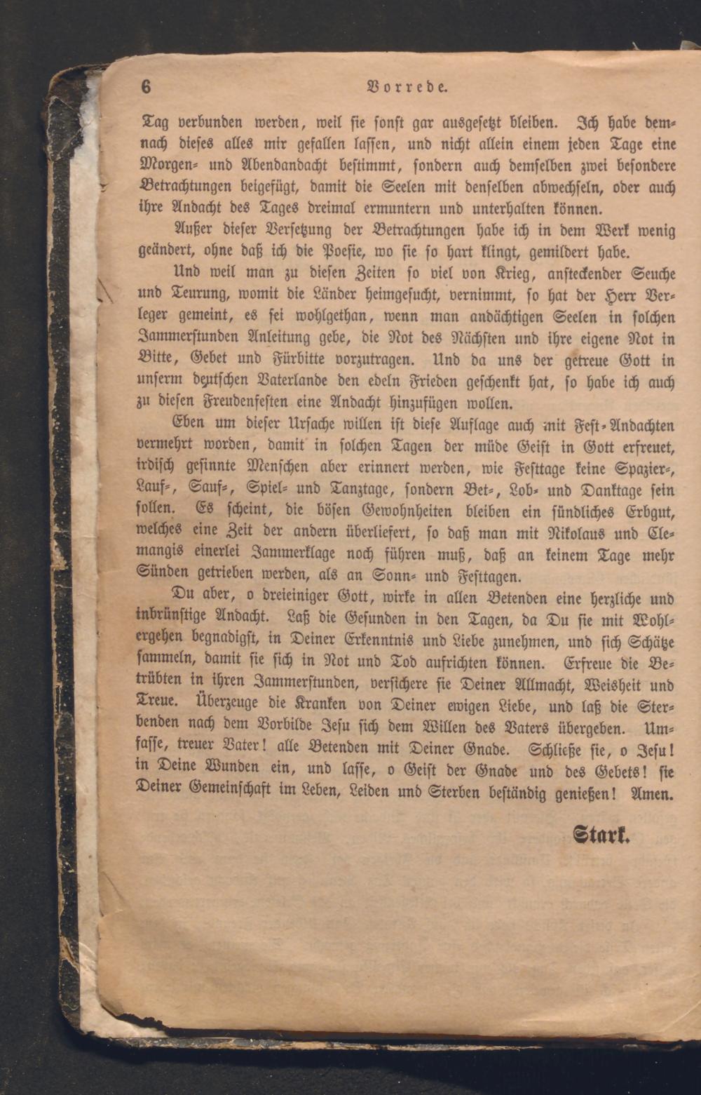 Und weil man zu diesen Beiten so viel von Krieg, ansteckender Seuche und Teurung, womit die Länder heimgesucht, vernimmt, so hat der Herr Verleger gemeint, es fei wohlgethan, wenn man andächtigen Seelen in solchen Jammerstunden Anleitung gebe, die Not des Nächsten und ihre eigene Not in Bitte, Gebet und Fürbitte vorzutragen. Und da uns der getreue Gott in unserm deutschen Vaterlande den edeln Frieden geschenkt hat, so habe ich auch zu diesen Freudenfesten eine Andacht hinzufügen wollen.