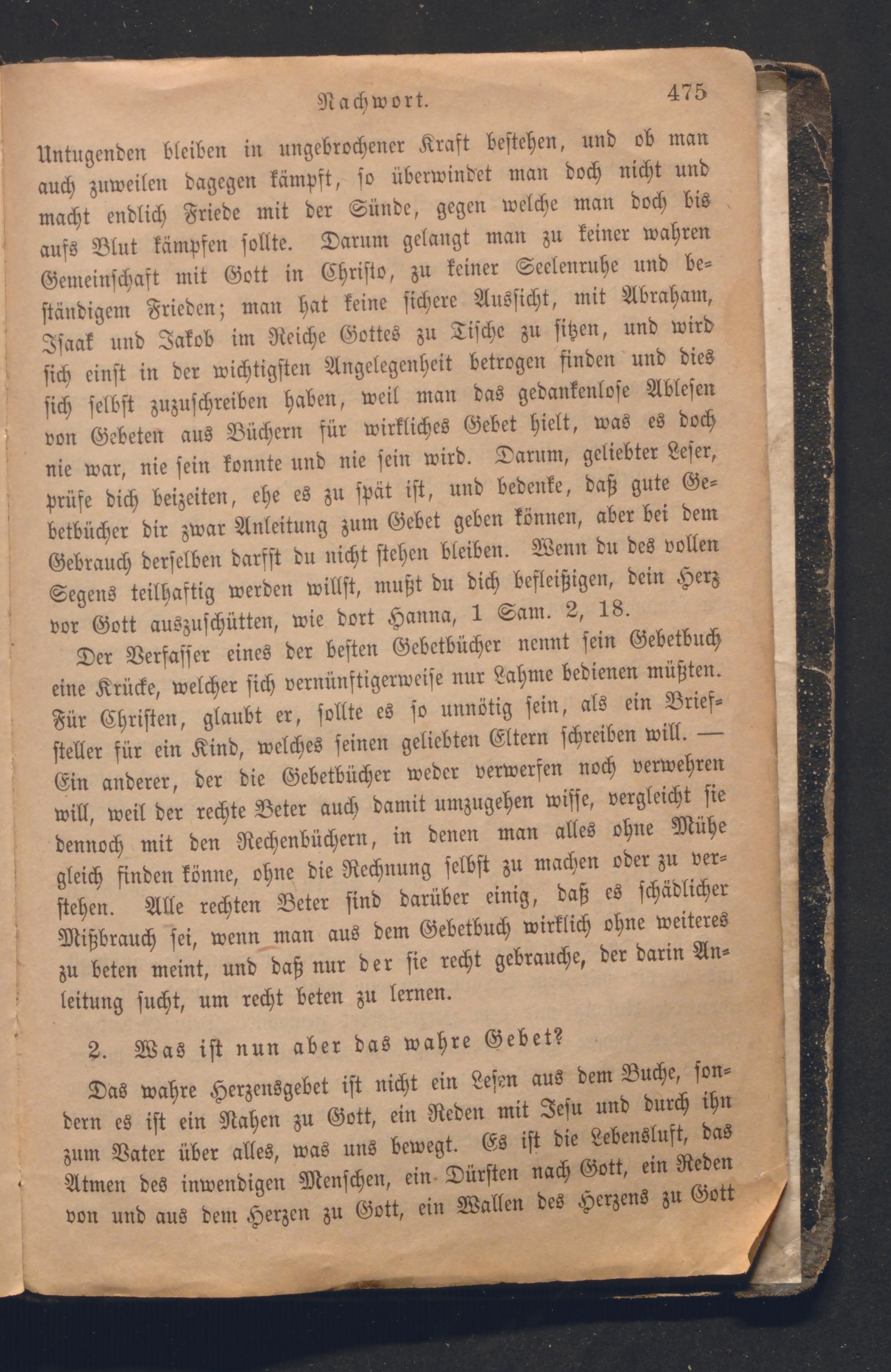 Untugenden bleiben in ungebrochener Kraft bestehen, und ob man auch zuweilen dagegen kämpft, so überwindet man doch nicht und macht endlich Friede mit der Sünde, gegen welche man doch bis aufs Blut kämpfen sollte. Darum gelangt man zu keiner wahren Gemeinschaft mit Gott in Christo, zu feiner Seelenruhe und beständigem Frieden; man hat keine sichere Aussicht, mit Abraham, Isaak und Jakob im Reiche Gottes zu Tische zu sitzen, und wird sich einst in der wichtigsten Angelegenheit betrogen finden und dies sich selbst zuzuschreiben haben, weil man das gedankenlose Ablesen von Gebeten aus Büchern für wirkliches Gebet hielt, was es doch nie war, nie sein konnte und nie sein wird. Darum, geliebter Leser, prüfe dich beizeiten, ehe es zu spät ist, und bedenke, daß gute Ge= betbücher dir zwar Anleitung zum Gebet geben können, aber bei dem Gebrauch derselben darfst du nicht stehen bleiben. Wenn du des vollen Segens teilhaftig werden willst, mußt du dich befleißigen, dein Herz vor Gott auszuschütten, wie dort Hanna, 1 Sam. 2, 18.
