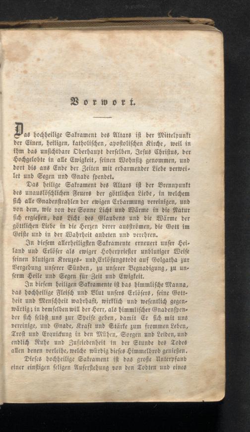as hochheilige Sakrament des Altars ist der Mittelpunkt der Einen, heiligen, katholischen, apostolischen Kirche, weil in ihm das unsichtbare Oberhaupt derselben, Jesus Christus, der Hochgelobte in alle Ewigkeit, seinen Wohnsiz genommen, und dort bis ans Ende der Zeiten mit erbarmender Liebe verweilet und Segen und Gnade spendet.