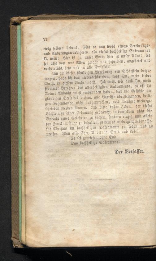 Um zu dieser schuldigen Verehrung ein Schärflein beizutragen, habe ich das niedergeschrieben, was Du, mein lieber Christ, in diesem Buche findest. Ich weiß, wie auch Du, mein frommer Verehrer des allerheiligsten Sakraments, es oft bei Deiner Andacht wirst empfunden baben, daß die Gefühle der gläubigen Seele bei diesem, alle Begriffe übersteigenden, heiligen Gegenstande nicht ausgesprochen, noch weniger niedergeschrieben werden können. Ich bitte daher Jeden, der dieses Büchlein zu seiner Erbauung gebraucht, in demselben nicht die Sprache eines Gelehrten zu suchen, sondern einzig und allein den Zweck im Auge zu behalten, zu dem es niedergeschrieben: Jefus Christus im Hochheiligen Sakramente zu loben und zu preisen. Ihm also Ehre, Anbetung, Preis und Lob!