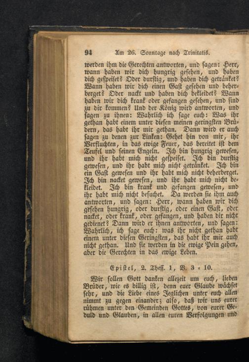 werden ihm die Gerechten antworten, und sagen: Herr, wann haben wir dich hungrig gesehen, und haben dich gespeiset? Oder durstig, und haben dich getränket? Wann haben wir dich einen Gast gesehen und beherberget? Oder nackt und haben dich bekleidet? Wann haben wir dich krank oder gefangen gesehen, und sind zu dir kommen? Und der König wird antworten, und fagen zu ihnen: Wahrlich ich sage euch: Was ihr gethan habt einem unter diesen meinen geringsten Brůdern, das habt ihr mir gethan. Dann wird er auch sagen zu denen zur Linken: Gehet hin von mir, ihr Verfluchten, in das ewige Feuer, das bereitet ist dem Teufel und seinen Engeln. Ich bin hungrig gewesen, und ihr habt mich nicht gespeiset. Ich bin durstig gewesen, und ihr habt mich nicht getränket. Ich bin ein Gast gewesen und ihr habt mich nicht beherberget. Ich bin nacket gewesen, und ihr habt mich nicht beKleidet. Ich bin krank und gefangen gewesen, und ihr habt mich nicht besuchet. Da werden sie ihm auch antworten, und sagen: Herr, wann haben wir dich gesehen hungrig, oder durstig, oder einen Gast, oder nacket, oder krank, oder gefangen, und haben dir nicht gedienet? Dann wird er ihnen antworten, und sagen: Wahrlich, ich sage euch: was ihr nicht gethan habt einem unter diesen Geringsten, das habt ihr mir auch nicht gethan. Und sie werden in die ewige Pein gehen, aber die Gerechten in das ewige Leben.