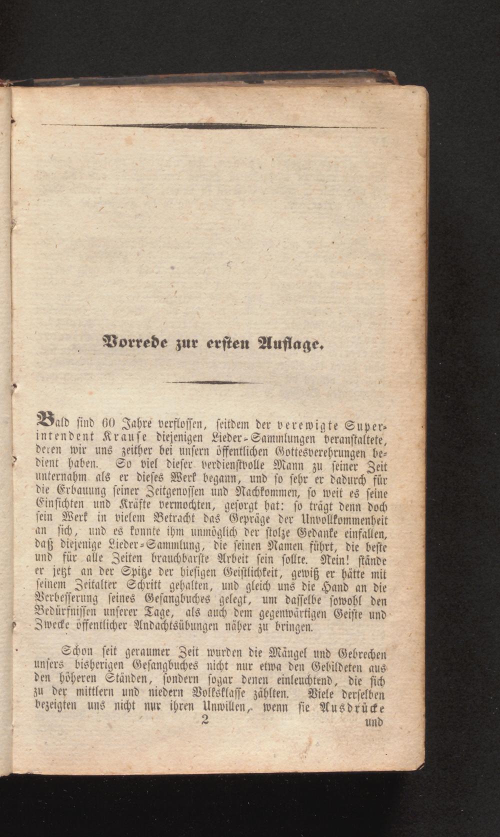 Bald find 60 Jahre verflossen, seitdem der verewigte Superintendent Krause diejenigen Lieder- Sammlungen veranstaltete, deren wir uns zeither bei unsern öffentlichen Gottesverehrungen bedient baben. So viel dieser verdienstvolle Mann zu seiner Zeit unternahm als er dieses Werk begann, und so sehr er dadurch für die Erbauung seiner Zeitgenossen und Nachkommen, so weit es seine Einsichten und Kräfte vermochten, gesorgt hat: so trägt denn doch sein Werk in vielem Betracht das Gepräge der Unvollkommenheit an sich, und es konnte ihm unmöglich der stolze Gedanke einfallen, daß diejenige Lieder- Sammlung, die seinen Namen führt, die beste und für alle Zeiten brauchbarste Arbeit sein sollte. Nein! stände er jetzt an der Spitze der hiesigen Geistlichkeit, gewiß er hätte mit seinem Zeitalter Schritt gehalten, und gleich uns die Hand an die Verbesserung seines Gesangbuches gelegt, um dasselbe sowohl den Bedürfnissen unserer Tage, als auch dem gegenwärtigen Geiste und Zwecke öffentlicher Andachtsübungen näher zu bringen.