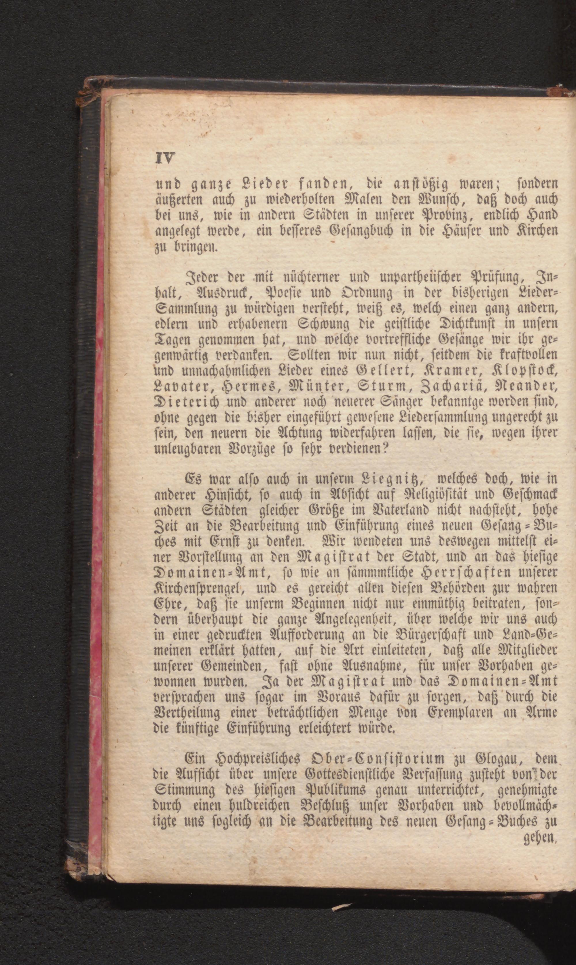 Ein Hochpreisliches Ober- Consistorium zu Glogau, dem die Aufsicht über unsere Gottesdienstliche Verfassung zusteht von der Stimmung des hiesigen Publikums genau unterrichtet, genehmigte durch einen huldreichen Beschluß unser Vorhaben und bevollmäch tigte uns sogleich an die Bearbeitung des neuen Gesang- Buches zu gehen.