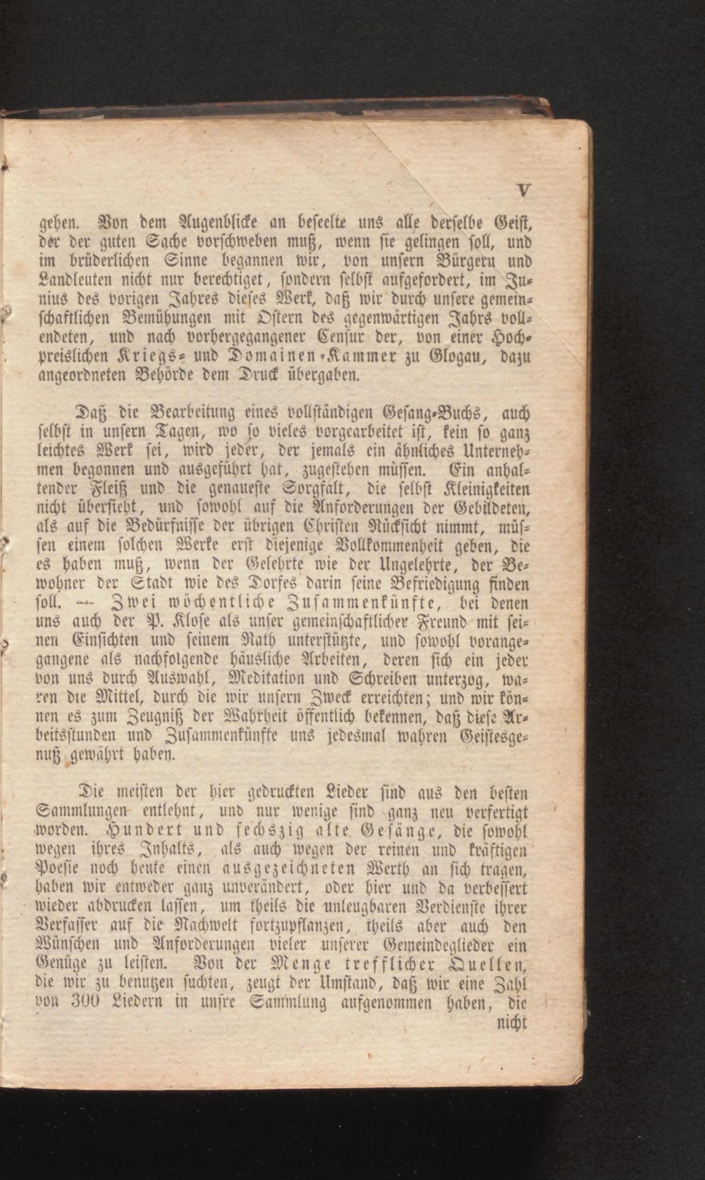 Die meisten der hier gedruckten Lieder sind aus den besten Sammlungen entlehnt, und nur wenige sind ganz neu verfertigt worden. Hundert und sechszig alte Gesänge, die sowohl wegen ihres Inhalts, als auch wegen der reinen und kräftigen Poesie noch heute einen ausgezeichneten Werth an sich tragen, haben wir entweder ganz unverändert, oder hier und da verbessert wieder abdrucken lassen, um theils die unleugbaren Verdienste ihrer Verfasser auf die Nachwelt fortzupflanzen, theils aber auch den Wünschen und Anforderungen vieler unserer Gemeindeglieder ein Genüge zu leisten. Von der Menge trefflicher Quellen, die wir zu benuten suchten, zeugt der Umstand, daß wir eine Zahl von 300 Liedern in unsre Sammlung aufgenommen haben, die nicht