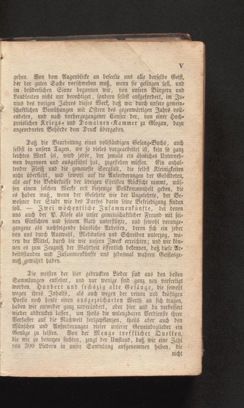 Daß die Bearbeitung eines vollständigen Gesang- Buchs, auch selbst in unsern Tagen, wo so vieles vorgearbeitet ist, fein so ganz leichtes Werk sei, wird jeder, der jemals ein ähnliches Unterneh men begonnen und ausgeführt hat, zugestehen müssen. Ein anhaltender Fleiß und die genaueste Sorgfalt, die selbst Kleinigkeiten nicht übersieht, und sowohl auf die Anforderungen der Gebildeten, als auf die Bedürfnisse der übrigen Christen Rücksicht nimmt, müssen einem solchen Werke erst diejenige Vollkommenheit geben, die es haben muß, wenn der Gelehrte wie der Ungelehrte, der Bewohner der Stadt wie des Dorfes darin seine Befriedigung finden soll. 3wei wöchentliche Zusammenfünfte, bei denen uns auch der P. Klose als unser gemeinschaftlicher Freund mit seinen Einsichten und seinem Rath unterstüzte, und sowohl vorange= gangene als nachfolgende häusliche Arbeiten, deren sich ein jeder von uns durch Auswahl, Meditation und Schreiben unterzog, waren die Mittel, durch die wir unsern Zweck erreichten; und wir können es zum Zeugniß der Wahrheit öffentlich bekennen, daß diese Arbeitsstunden und Zusammenkünfte uns jedesmal wahren Geistesgenuß gewährt haben.