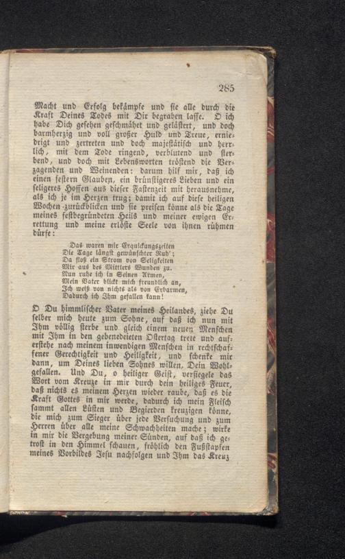 D Du himmlischer Vater meines Heilandes, ziehe Du selber mich heute zum Sohne, auf daß ich nun mit Ihm völlig sterbe und gleich einem neuen Menschen mit Ihm in den gebenedeieten Ostertag trete und auf erstehe nach meinem inwendigen Menschen in rechtschaf fener Gerechtigkeit und Heiligkeit, und schenke mir dann, um Deines lieben Sohnes willen, Dein Wohl gefallen. Und Du, o heiliger Geist, versiegele das Wort vom Kreuze in mir durch dein heiliges Feuer, daß nichts es meinem Herzen wieder raube, daß es die Kraft Gottes in mir werde, dadurch ich mein Fleisch fammt allen Lüften und Begierden kreuzigen könne, die mich zum Sieger über jede Versuchung und zum Herren über alle meine Schwachheiten mache; wirke in mir die Vergebung meiner Sünden, auf daß ich getrost in den Himmel schauen, fröhlich den Fußstapfen meines Vorbildes Jesu nachfolgen und Ihm das Kreuz