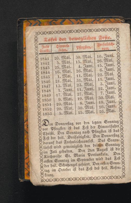 vor Pfingsten ist das Fest der Himmelfahrt Christi. Den Sonntag nach Pfingsten ist das Fest der heil. Dreifaltigkeit. Den Donnerstag darauf das Frohnleichnamfest. Das Scapulirfest wird gemeiniglich den dritten Sonntag im Juli gehalten. Den 2ten August ist die Kirchweihe St. Maria Portiuntula. Den ersten Sonntag im September wird das Fest der heil. Schutzengel gefeiert. Den ersten Sonntag im October ist das Fest des heil. Rosenfranz.