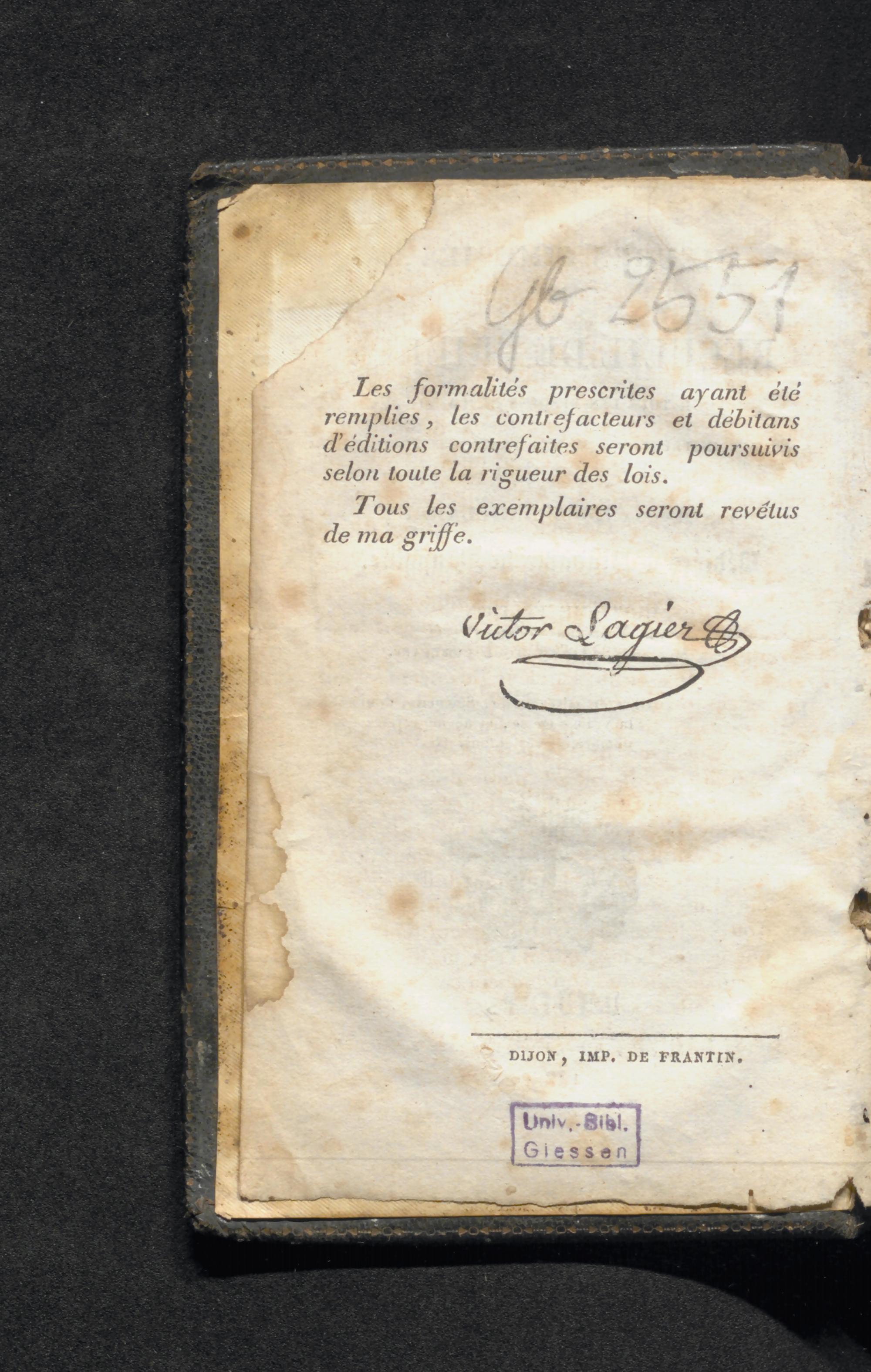 Les formalités prescrites ayant été remplies, les contrefacteurs et débitans d'éditions contrefaites seront poursuivis selon toute la rigueur des lois.