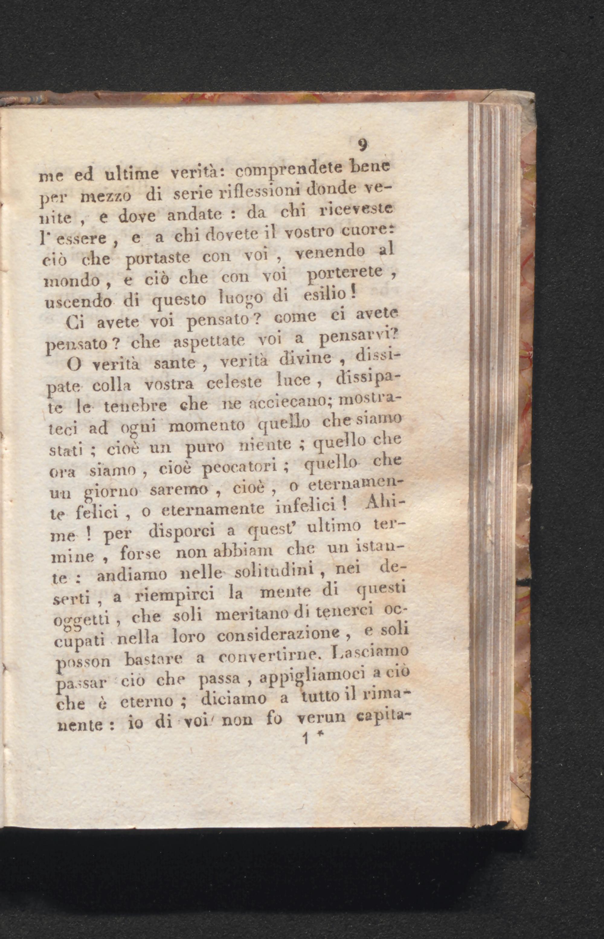 O verità sante, verità divine, dissipate colla vostra celeste luce, dissipate le tenebre che ne acciecano; mostrateci ad ogni momento quello che siamo stati; cioè un puro niente; quello che ora siamo, cioè peocatori; quello che un giorno saremo, cioè, o eternamente felici, o eternamente infelici! Ahime per disporci a quest' ultimo termine, forse non abbiam che un istante: andiamo nelle solitudini, nei deserti, a riempirci la mente di questi oggetti, che soli meritano di tenerci occupati nella loro considerazione, e soli posson bastare a convertirne. Lasciamo passar ciò che passa, appigliamoci a ciò che è eterno; diciamo a tutto il rimanente: io di voi non fo verun capita1*