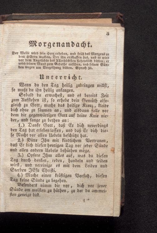 Sobald du erwachest, und es bereits Zeit zum Aufstehen ist, so erhebe dein Gemüth also= gleich zu Gott, mache das heilige Kreuz, kleide dich ohne zu säumen an, und alsdann falle vor dem dir gegenwärtigen Gott auf deine Knie nieder, und fange zu bethen an: