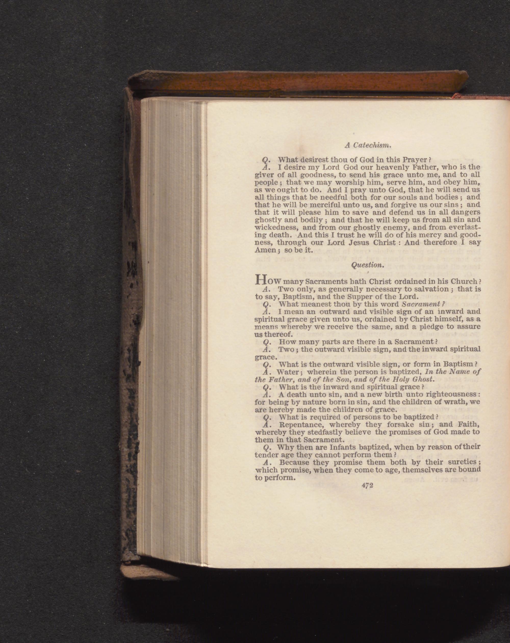 Q. What is the outward visible sign, or form in Baptism? A. Water; wherein the person is baptized, In the Name of the Father, and of the Son, and of the Holy Ghost.