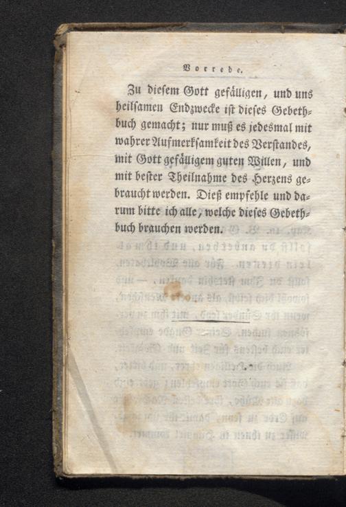 Zu dieſem Gott gefälligen, und uns heilsamen Endzwecke ist dieses Gebethbuch gemacht; nur muß es jedesmal mit wahrer Aufmerksamkeit des Verstandes, mit Gott gefälligem guten Willen, und mit bester Theilnahme des Herzens gebraucht werden. Dieß empfehle und darum bitte ich alle, welche dieses Gebethbuch brauchen werden.