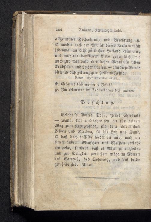 Gelobt sei Gottes Sohn, Jesus Christus! Dank, Lob und Ehre sey dir für deinen Weg zum Kreuzestode, für dein schreckliches Leiden und Sterben, sei dir Lob und Dank. O daß doch dasselbe weder an mir, noch an einem andern Menschen und Christen verloh= ren gehe, sondern daß es Allen zum Heile, und zur Seligkeit gereichen möge im Namen des Vaterst, des Sohnest, und des heiligent Geistes. Amen.