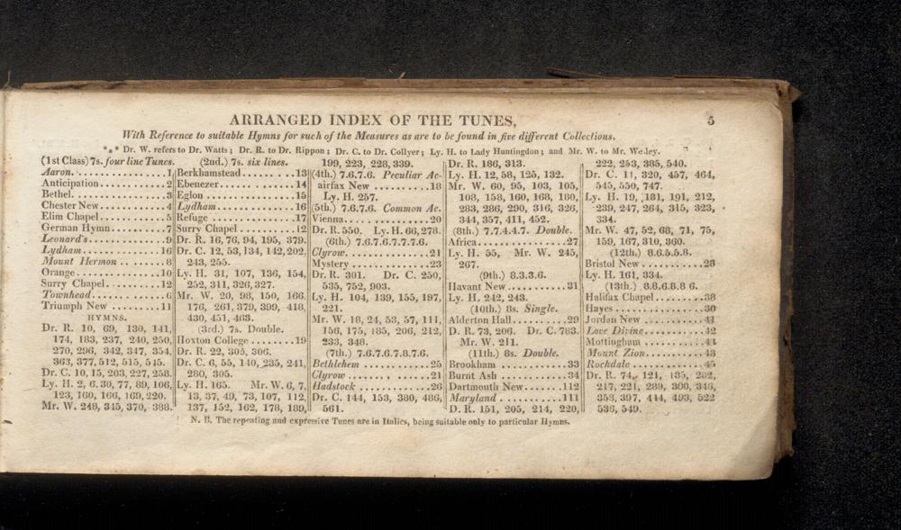 With Reference to suitable Hymns for such of the Measures as are to be found in five different Collections. *** Dr. W. refers to Dr. Watts; Dr. R. to Dr. Rippon; Dr. C. to Dr. Collyer; Ly. H. to Lady Huntingdon; and Mr. W. to Mr. We dey. ( 1st Class) 7s. four line Tunes.