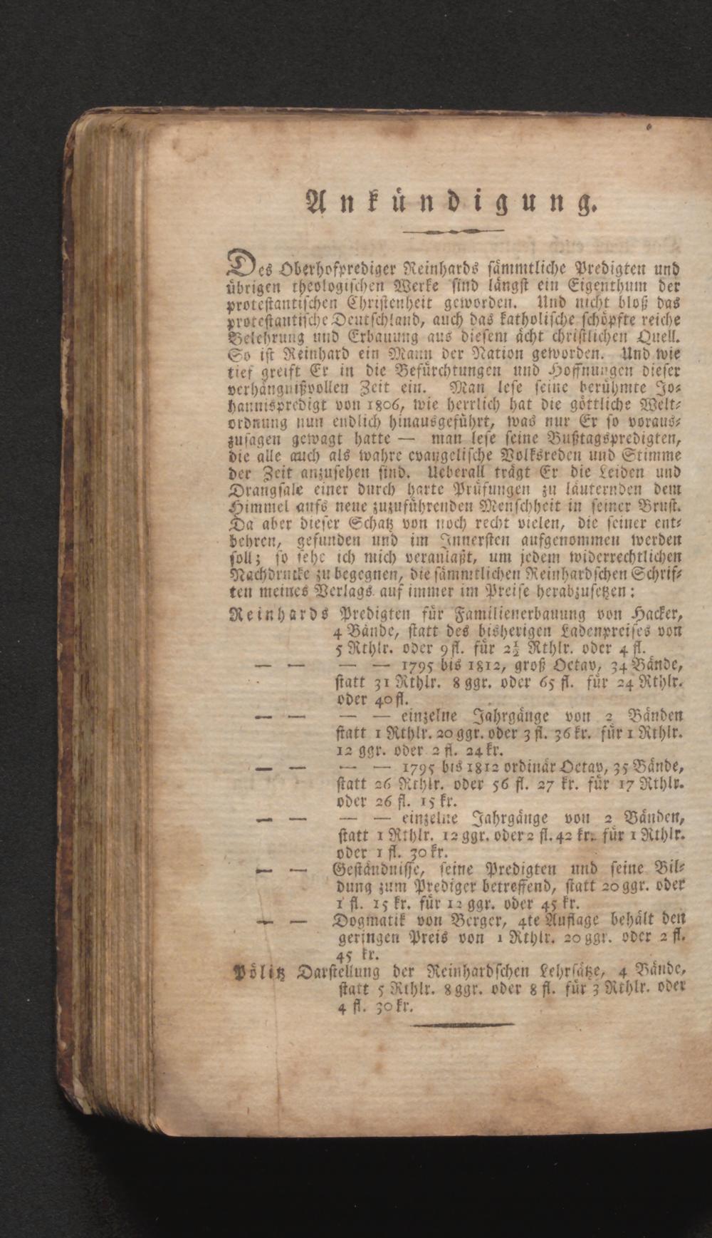 es Oberhofprediger Reinhards sämmtliche Predigten und übrigen theologischen Werke sind längst ein Eigenthum der protestantischen Christenheit geworden. Und nicht bloß das protestantische Deutschland, auch das katholische schöpfte reiche Belehrung und Erbauung aus diesent acht christlichen Quell. So ist Reinhard ein Mann der Nation geworden. Und wie tief greift Er in die Befürchtungen und Hoffnungen dieser verhängnißvollen Zeit ein. Man lese seine berühmte Jos hannispredigt von 1806, wie herrlich hat die göttliche Weltordnung nun endlich hinausgeführt, was nur Er so voraus: zusagen gewagt hatte man lese seine Bußtagspredigten, die alle auch als wahre evangelische Volksreden und Stimme der Zeit anzusehen sind. Ucberall trägt Er die Leiden und Drangsale einer durch harte Prüfungen zu lauternden dem Himmel aufs neue zuzuführenden Menschheit in seiner Brust. Da aber dieser Schatz von noch recht vielen, die seiner ents behren, gefunden und im Innersten aufgenommen werden foll; so sehe ich mich veranlaßt, um jedem widerrechtlichen Nachdrucke zu begegnen, die sämmtlichen Reinhardschen Schrifs ten meines Verlags. auf immer im Preise herabzufeßen: Reinhards Predigten für Familienerbauung von Hacker, 4 Bände, statt des bisherigen Ladenpreises von