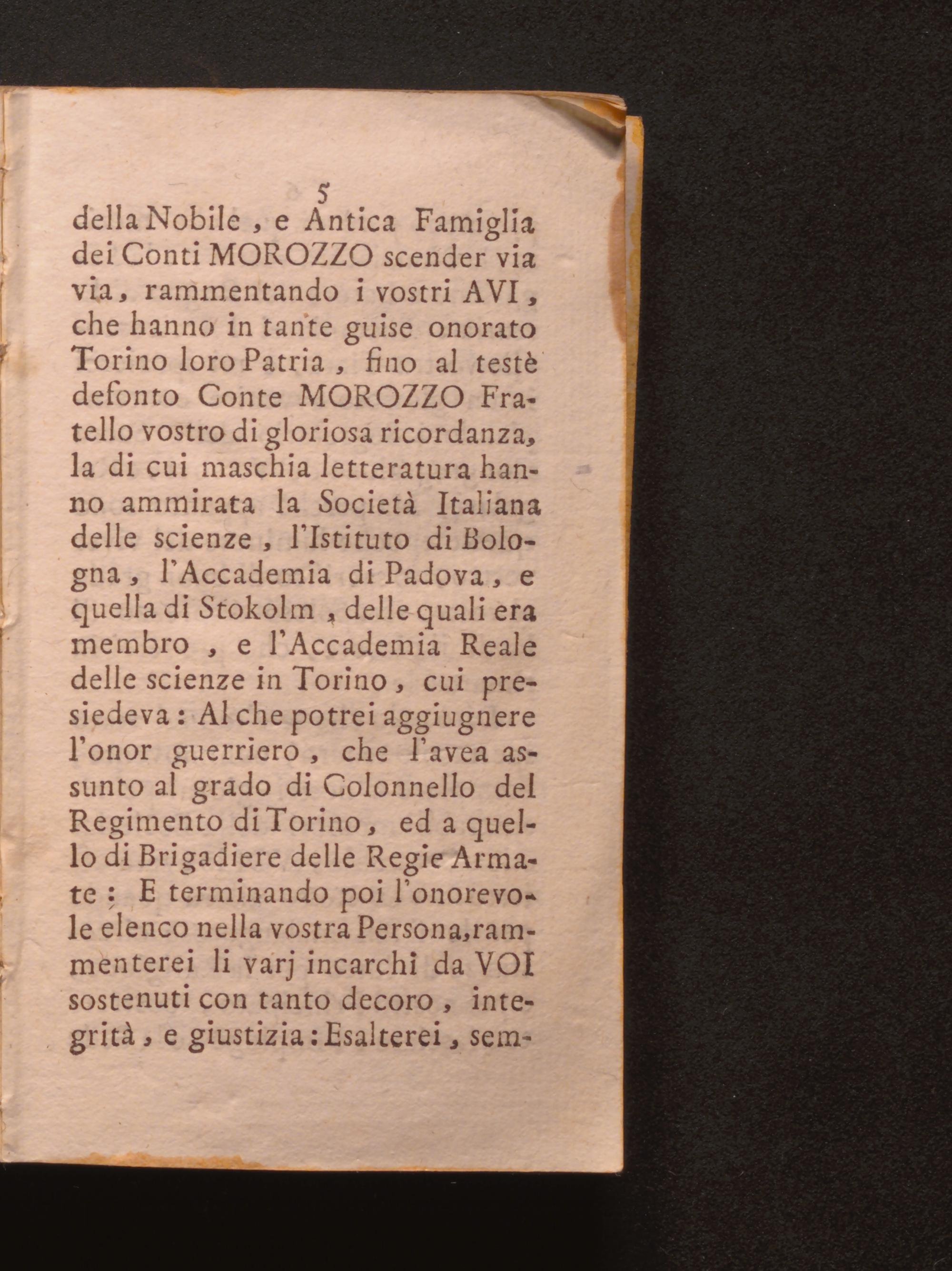della Nobile, e Antica Famiglia dei Conti MOROZZO scender via via, rammentando i vostri AVI, che hanno in tante guise onorato Torino loro Patria, fino al testè defonto Conte MOROZZO Fratello vostro di gloriosa ricordanza, la di cui maschia letteratura hanno ammirata la Società Italiana delle scienze, l'Istituto di Bologna, l'Accademia di Padova, e quella di Stokolm, delle quali era membro, e l'Accademia Reale delle scienze in Torino, cui presiedeva: Al che potrei aggiugnere l'onor guerriero, che l'avea assunto al grado di Colonnello del Regimento di Torino, ed a quello di Brigadiere delle Regie Armate: E terminando poi l'onorevole elenco nella vostra Persona, rammenterei li varj incarchi da VOI sostenuti con tanto decoro, integrità, e giustizia: Esalterei, sem