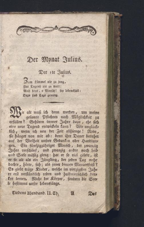 ie alt muß ich denn werden, um meine gesamte Pflichten nach Möglichkeit zu erfüllen? Gehören immer Jahre dazu, ehe sich eine neue Tugend entwickeln kann? Wie unglücks lich, wenn ich von der Zeit abhienge! Nein, sie hänget von mir ab: denn ihre Dauer beruhet auf der Vielheit unsrer Gedanken oder Handluns gen. Ein fünfzigjähriger Mensch, der zwanzig Jahre verschlief, und zwanzig andre nach Leib und Seele mäßig gieng: hat er so viel gelebt, ist er so alt als ein Jüngling, der jeden Tag mehr dachte, hörte, sab; als jener binnen Monatsfrist? Es giebt tråge Kinder, welche im vierzigsten Jahs re erst verständlich reden und halbmenschlich dens ten lernen. Nicht der Körper, sondern die Sees le bestimmt unsre Lebenslänge.