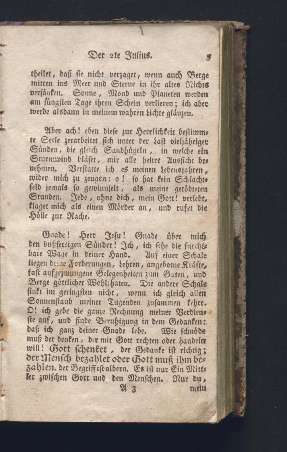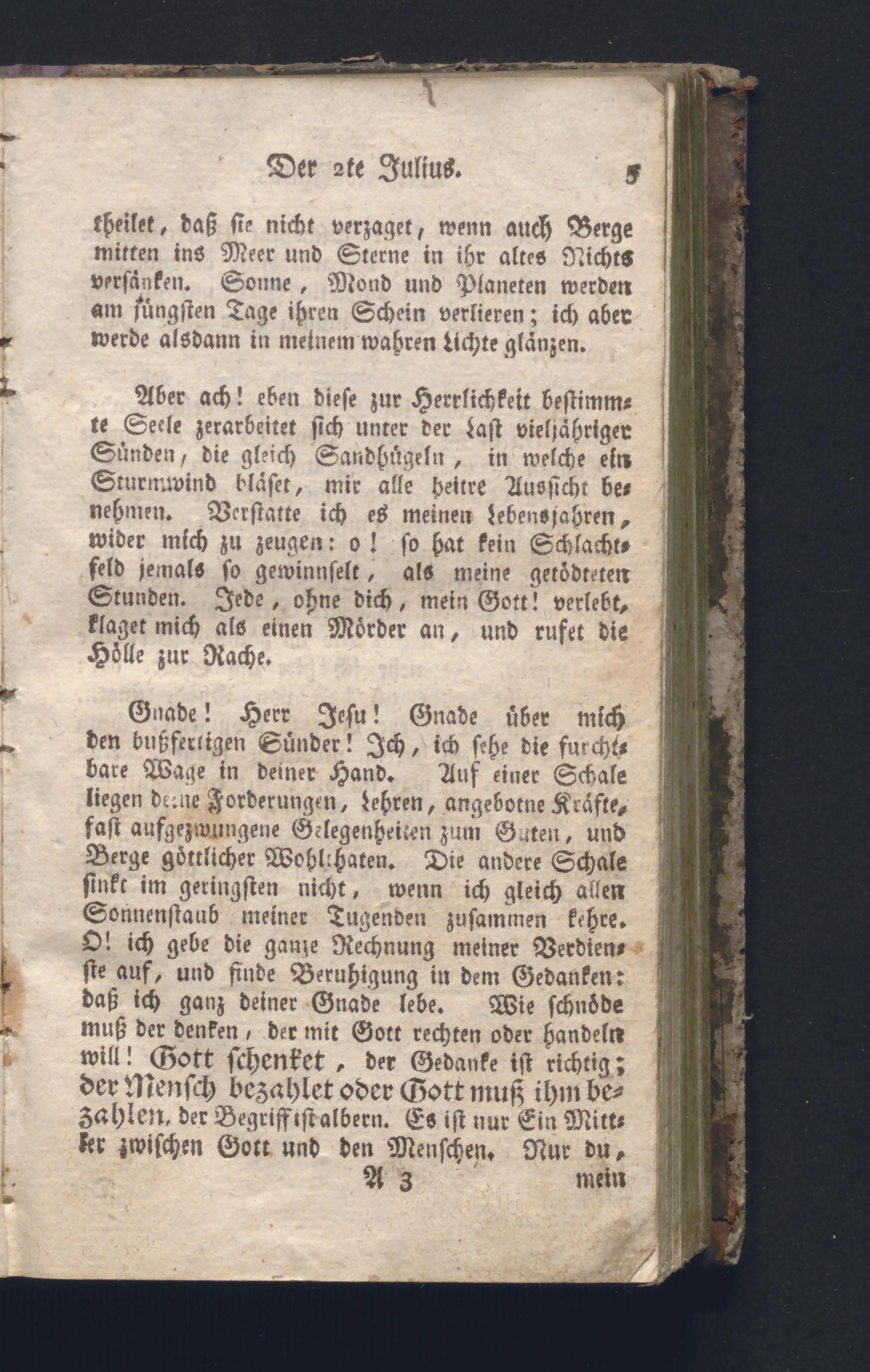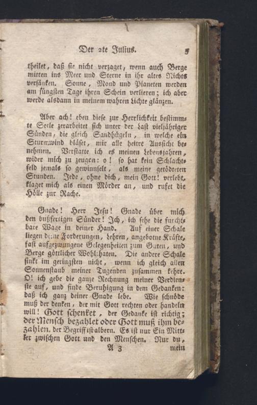 Aber ach! eben diese zur Herrlichkeit bestimme te Seele zerarbeitet sich unter der last vieljähriger Sünden, die gleich Sandhügeln, in welche ein Sturmwind blåset, mir alle heitre Aussicht bes nehmen. Verstatte ich es meinen Lebensjahren, wider mich zu zeugen: o! so hat kein Schlachts feld jemals so gewinnfelt, als meine getödtetett Stunden. Jede, ohne dich, mein Gott! verlebt, Flaget mich als einen Mörder an, und rufet die Hölle zur Rache.