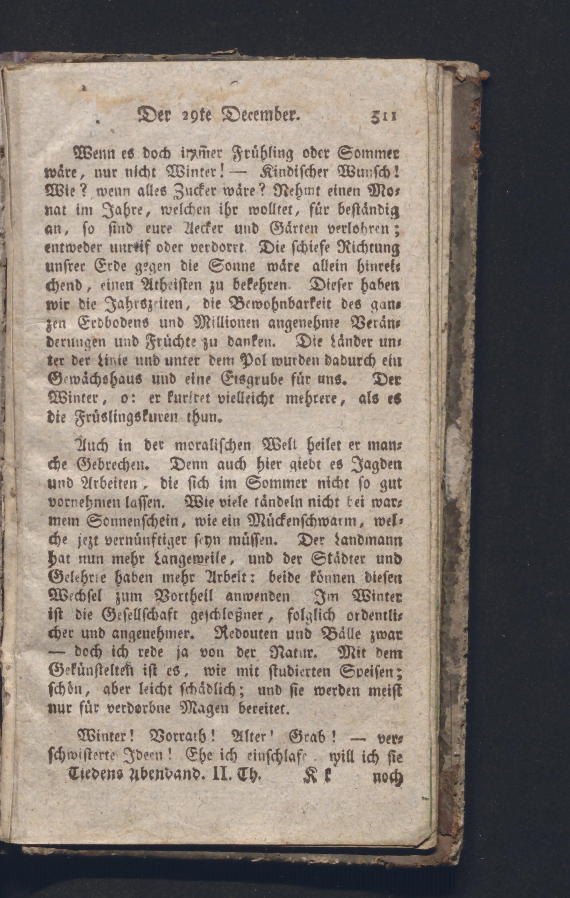 Wenn es doch immer Frühling oder Sommer wåre, nur nicht Winter! Kindischer Wunsch! Wie? wenn alles Zucker wäre? Nehmt einen Mos nat im Jahre, welchen ihr wolltet, für beständig an, so sind eure Uecker und Gärten verlohren; entweder unreif oder verdorrt. Die schiefe Richtung unfrer Erde gegen die Sonne wäre allein hinrefe chend, einen Atheisten zu belehren. Dieser haben wir die Jahrszeiten, die Bewohnbarkeit des gane zen Erdbodens und Millionen angenehme Verans derungen und Früchte zu danken. Die Länder uns ter der Linie und unter dem Pol wurden dadurch einr Gewächshaus und eine Etsgrube für uns. Der Winter, o: er furiret vielleicht mehrere, als es die Früslingskuren thun.