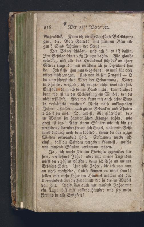 Ja, ich werde dir im Gerichte gegenüber stee ben, verfloßnes Jahr! aber nur meine Tugenden wirst du erzählen dürfen; denn ich stehe an meines Erlösers Seite. Und alle Jahre, die ich von nun an noch wechselte,( viele können es nicht seyn!) follen mir mehr Ehre im Himmel matben als du.. Unseränderlicher! erhalt mich bit in diesem Wirbel vou Zeit. Bald find auch mit tausend Jahre wie ein Tag: biff mir vollend hinüber und sen mein Freund in alle Ewigkeit!