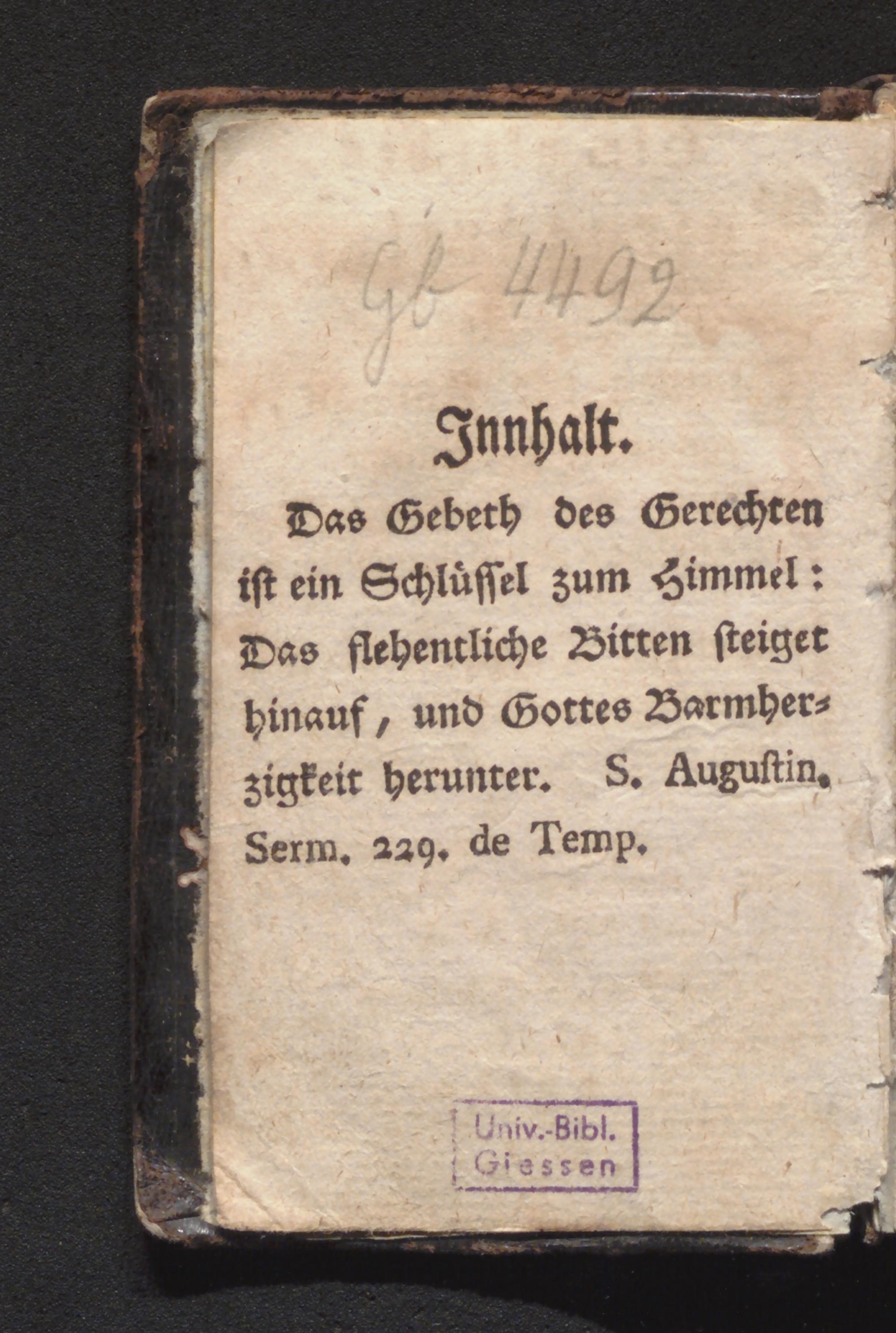 Das Gebeth des Gerechten ist ein Schlüssel zum Gimmel: Das flehentliche Bitten steiget hinauf, und Gottes Barmherzigkeit herunter. S. Auguftin, Serm, 229, de Temp.