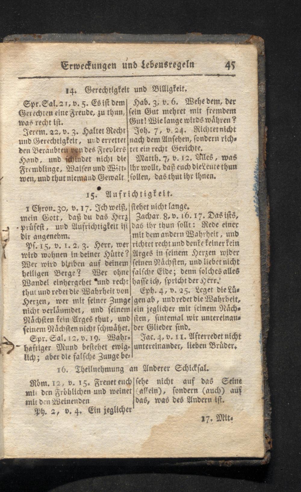 Jerem. 22, v. 3. Haltet Recht und Gerechtigkeit, und erretter den Beraubten von des Frevlere tet ein recht Gerichte. Hand, und schindet nicht die Matth. 7, v. 12. lles, was Fremdlinge, Walfen und Witt- thr wollt, daß euch diekeute thun wen, und thut niemand Gewalt. sollen, das thut ihr ihnen.